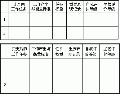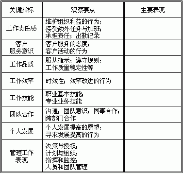 评价等级标准和操作说明: A.(10分) 出色,工作绩效始终超越本部门常规标准要求,通常具有下列表现:在规定的时间之前完成任务,完成任务的数量、质量等明显超出规定的标准,得到来自客户的高度评价。 B (8分) 优良,工作绩效经常超出本部门常规标准要求,通常具有下列表现:严格按照规定的时间要求完成任务并经常提前完成任务,经常在数量、质量上超出规定的标准,获得客户的满意。 C (6分) 可接受,工作绩效经常维持或偶尔超出本部门常规标准要求,通常具有下列表现:基本上达到规定的时间、数量、质量等工作标准,没有客户的不满意。 D (4分) 需改进,工作绩效基本维持或偶尔未达到本部门常规标准要求,通常具有下列表现:偶有小的疏漏,有时在时间、数量、质量上达不到规定的工作标准,偶尔有客户的投诉。 E (2分) 不良,工作绩效显著低于常规本部门正常工作标准的要求,通常具有下列表现:工作中出现大的失误,或在时间、数量、质量上达不到规定的工作标准,经常突击完成任务,经常有投诉发生。 第二部分