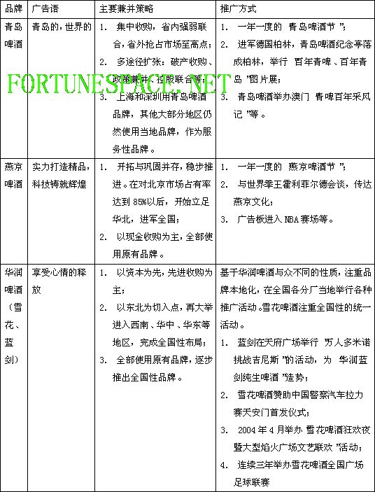 品牌塑造是个长期工程,青岛和燕京都是全国性品牌,与此相反,华润啤酒所收购的雪花、华丹、黑狮、瑞德、莱格以及蓝剑等数十个品牌都是区域性名牌,但这不等于华润啤酒就不重视品牌的塑造, 伴随着华润啤酒资本战的将是品牌战。 全国品牌和区域品牌整合策略 华润因为是一个相当大的跨行业集团,啤酒只是其业务之一,企业名和啤酒品牌名不统一,不象青岛、燕京、珠江、哈啤等啤酒企业,产品品牌与企业名统一,传播上容易形成合力。但是我们不得不承认华润啤酒现在在中国市场的成功运做,已使其旗下的雪花品牌成为全国最有影响力和最有潜力的啤酒品牌,已被全国市场所接受(见表1),与此同时,华润啤酒那数十个区域性啤酒品牌,在当地具有很强的市场占有率、品牌知名度和忠诚度,具有很强的竞争力。出于全国资源的有效整合角度考虑,华润啤酒对其品牌整合势在必行。 为了推出全国品牌而整合众多区域强势品牌,会不会“忍痛割爱”甚至是“赔了夫人又折兵”?这中间的矛盾该如何调整?对此,华润啤酒采取“先区域品牌,后全国品牌”的推广战略,先把当地的区域品牌整合好,使之成为当地的主导品牌,在此基础上再考虑全国品牌的推广。全国品牌与区域品牌协调整合方面。华润啤酒采用“全国品牌+区域强势品牌+区域战术品牌”的推广战略,有效阻击了竞争对手,逐渐形成自身品牌的竞争合力。全国品牌提供品牌资产,为现在和将来经营提供保障;区域强势品牌是品牌资产的一部分,把在区域市场里已经达到非常大的份额、知名度、忠诚度的区域品牌优选出来,列为区域强势品牌,这是它经营的保障,像武汉行吟阁、四川蓝剑、浙江钱啤等,是当地消费者最容易接受的品牌,目前中国啤酒市场不可能形成由几个全国品牌的垄断地位,就是因为很多区域强势品牌有很强的竞争实力;区域战术品牌是抵御竞争的有力武器。中国啤酒的区域品牌非常多,在区域市场上经常有来犯产品,打也打不完。这种全国品牌加若干个优秀区域品牌的整合,使“华润啤酒舰队”有了更强的攻防能力。 表1. 三大啤酒品牌对比分析:
