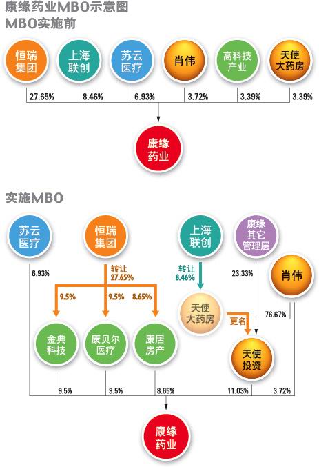 本次股权转让完成螅闳鸺沤辉俪钟小翱翟狄┮怠钡墓煞荩翱当炊搅啤焙汀敖鸬淇萍肌本钟?.5%,成为并列第二大股东;“康居房地产”持有8.65%,为第四大股东。 第一大股东把自己持有的股份拆细转让,国有股权分散退出的结果就是持有“康缘药业”11.03%股权的原第二大股东—“天使大药房”将成为第一大股东。而根据公司2002年9月的上市招股书披露,“天使大药房”的实际控制人是“康缘药业”董事长肖伟等4位高管,而这4人同时还是“康缘药业”的发起人股东,截至去年底合计持有公司6.68%股份。加上“天使大药房”的持股,目前肖伟等4人实际上共持有“康缘药业”17.71%的股权。 这是自2003年3月MBO叫停之后,首家通过主管部门认可的MBO案例。康缘药业可谓将曲线MBO的“曲折幽深”发挥到了登峰造极的境界。其主要的操作特点: 被动式MBO。“康缘药业”管理层取得公司的控制权,依靠的不是主动买股增加持股权而取得控制地位,而是由第一大股东在国资退出的背景下自愿退位,从而“被迫”当上第一大股东。 国资委审批。国资委批准的是“康缘药业”第一大股东恒瑞集团所持股权转让,收购恒瑞集团所持“康缘药业”国有股的是“康贝尔医疗”、“金典科技”、“康居房地产”,这3家公司不是“康缘药业”管理层控制的公司。“康缘药业”国有股转让表面上看是一起普通的国有股转让案例,而不是一起上市公司管理层收购案例。 巧用股权性质进行控制权集中。“康缘药业”管理层收购的非流通股股权为法人股无需国资委审批。“上海联创”系“康缘药业”的发起人,持有股权性质是法人股;“天使大药房”曾经是恒瑞集团控制的有限责任公司。尽管恒瑞集团是国有企业,但“天使大药房”持有“康缘药业”的股权也是法人股。当“康缘药业”管理层收购上述股权、将控制权进行集中时,皆无需国资委审批。