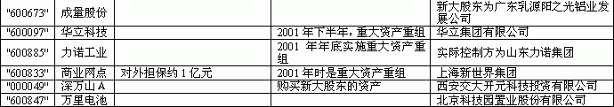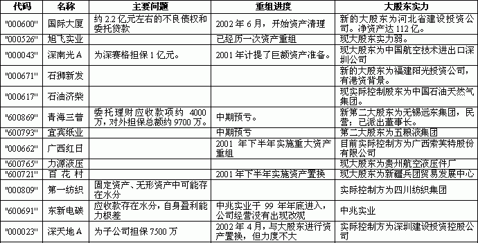 资产重组是市场中一个永恒的主题,小市值的壳资源股一直是市场中表现比较活跃的板块。虽然基于流动性的考虑,机构投资者一般难以参与小市值股票的投资,但作为一个现象,小市值壳资源股仍然值得关注;且个人以为,在分散投资的条件下,小市值壳资源股也可以成为投资组合的一个组成部分。 存在的问题。 1. 昌江芒果园,固定资产及土地使用权合计12500万元,占总资产32%,与全部净资产相当。这一块的价值以及运用效率均存在问题。 2. 销售中的80%为关联方交易。 3. 其他应收款中,杨凌高科欠资产重组款6451万元。 评价。资产重组比较彻底,新主营业务前景良好,重组过程中股价涨幅不大,未来具有上涨潜力。 力诺工业(600885) 实际控制人为山东力诺集团有限责任公司。该公司为民营企业,成立于1994年9月,注册资本5000万元,主营业务包括高硼硅材料及系列产品、药用玻璃、太阳能系列产品及有机硅类精细化工产品,是山东省科学技术委员会认定的高新技术企业,拥有自营进出口权。其中的“天然气辅助加热高硼硅玻璃”被国家科技部列入“国家级火炬计划项目”;A级国际标准药用玻璃被国家计委列入“国家高新技术重点示范项目”。 重组情况。2001年10月,公司进行重大资产重组,以原有油漆类资产换入高硼硅材料资产。重组后,公司业务转向高硼硅材料和特种玻璃的生产销售。由于重组时间晚,新业务的盈利能力未能在2001年体现。 存在问题。公司在油漆业务方面仍有近4000万元的投资;应收款项高达1.5亿,好在帐龄较短;资产负债率高达75%。 评价。力诺集团实力尚可,具有新材料的概念;公司作为该集团的唯一上市公司,集团应当还会有进一步的重组动作。 商业网点(600833) 公司新的大股东为上海新世界集团。 重组情况。公司经过2001年一系列的资产重组后,目前主营医药流通业,主要盈利资产为全资子公司上海第一医药商店以及蔡同德药业50%股权。 存在问题。对外担保约有1亿元;母公司原有存货可能还存在水分;重组后盈利能力还比较单薄。 评价。新股东在公司重组中付出了巨大代价,预计还有进一步重组以加强公司的盈利能力,最终使公司恢复在融资能力。 以上三个公司都属于重大资产重组,存在通过增发再融资的可能性。 第二类:新的实力较强的大股东已经入主,资产重组尚未进行或刚刚开始。 国际大厦(000600) 公司新的大股东为河北省建设投资公司。该公司是隶属于河北省人民政府,主要从事基础设施、基础产业、高科技产业投资开发的政策性投资机构。截止2000年底,公司总资产140.4亿元,其中净资产107亿元,历年积累基金100多亿元。公司控股、参股建设大型电力项目10个,装机1000万千瓦;此外公司投资项目还涉及交通、化工、建材、农业、高科技等多个行业,分布全省各地。 重组情况。2001年9月,河北省建设投资公司正式成为公司第一大股东。2002年6月,上市公司向大股东转让对世贸广场和物华大厦的不良股权,涉及金额4000万元左右,标志着资产重组开始展开。 存在问题。世贸广场和物华大厦目前仍占用上市公司资金约3亿元。公司目前主业(酒店和商贸)盈利能力很差,2002年中期预亏。 评价。上市公司要想获得新生,必须解决3亿元的不良资产问题,同时还需有新的利润点的注入;大股东河北省建设投资公司应当具有这样的能力和资源。 成量股份(600673) 公司新的大股东为广东乳源阳之光铝业发展有限公司。该公司由乳源瑶族自治县阳之光实业发展有限公司(法人代表:郭京平,占70.23%股份)、香港南北兄弟国际投资公司(法人代表:毛杰,占29.77%股份)等两家企业投资组建。公司总资产为17600万元,净资产为16000万元,销售收入为23100万元,利润为4200万元。营业务为新型节能环保材料—亲水箔及真空镀膜的生产以及相关技术和设备的研发制造。 重组情况。2002年2月,阳之光铝业发展公司与成量集团签订受让协议,受让29%股权,协议有待财政部批准。受让方拟将其所拥有的优质资产注入成量股份公司,同时将成量集团公司及成量股份公司原资产进行剥离,用于安置职工和组建新的公司。 存在问题。成量集团积欠2553万元的往来款;存货净额1.6亿,其中库存商品净额1亿,可能存在问题。总的看来,资产比较干净;原有业务具有一定的盈利能力。 评价。目前公司资产比较干净,其自身具有一定盈利能力;新大股东实力较强,其主营业务具有良好的概念;值得重点关注。 第三类:公司质地尚可,现大股东实力比较弱,可能出现股权转让或资产重组 力源液压(600765) 公司现任大股东为贵阳航空液压件厂,主营航空航天配套用液压泵、液压马达,兼营军用液压系统开发及第三产业。估计是原来的三线企业。 存在问题。大股东占用资金2200万元。公司盈利能力弱。 评价。总体上看,公司总资产规模小(2亿元左右);资产质量尚可。是一个比较理想的壳。 第一纺织(000809) 公司现任大股东为四川省纺织集团有限责任公司。该公司成立于1996年7月,注册资本6800万元,经营范围:工业原辅材料制成品的生产经营;组织省内外棉花的收购、加工、经营及进口计划棉的落实;纺织、化工、建材、服装服饰的生产销售;纺织成套设备及配件和机电产品的销售等。 存在问题。逾期贷款2500万元;经营状况差,2002年中期预亏。 评价。总资产规模不大,经营状况差,大股东实力弱;股权转让的可能性较大。 结论: 