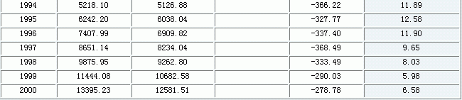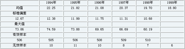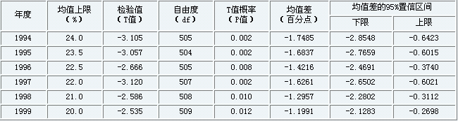 数据来源:《中国统计年鉴》(各年)。 这一变化的一个直接后果是在国有企业的总资产中由国家出资构成的份额不断下降。这一点在我们的1251户企业样本的数据中清晰可见。我们计算了这批样本中国有企业的国家资本比率(企业总资产中国家资本所占的比重)。表1.是计算的结果。从中可以看出,在1994~99年期间,样本中516户国有企业的国家资本比率平均值从22.25%下降至1999年18.80%。 表1:国有企业的国家资本比率(%) 说明:国家资本比率=国家资本额÷资产总额×100 为了进一步推断全国国有工业企业的国有资本比率,我们对表1.中各年的国有资本比率均值作单样本T检验,以估计样本总体中国家资本比率均值的上限。表2.是估计的结果。它显示,根据这批样本企业的国家资本比率均值推断出来的总体均值上限也在逐年下降,从1994年的24.0%下降为1999年的20.0%。 表2:国有工业企业中的国家资本比率上限(1251户)