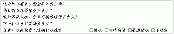 *达到盈亏平衡的时间? *拟引入风险投资总额? *当前月收入 *当前月支出 *投资与收益(如企业已成立请另附已有财务年度的相应财务报表) *开户银行 *简述本期风险投资的数额、退出策略、预计回报数额和时间表? 八、资本结构 *目前资本结构表 *本期资金到位后的资本结构表 *请说明你们希望寻求什么样的投资者?(包括投资者对行业的了解,资金上、管理上的支持程度等) 九、其它 *请说明为什么投资人应该投贵企业而不是别的企业? *您认为企业成功的关键因素是什么? *关于企业和产品是否还有其它需要介绍的内容,是否有企业或产品的手册、文章、图片、用户反馈等有关验证资料? 提示: 确信在你的商业计划书中,已尽可能地回答了如下问题: 1、你的管理队伍拥有什么类型的业务经验﹖ 2、你的管理队伍中的成员有成功者吗﹖ 3、每位管理成员的动机是什么﹖ 4、你的公司和产品如何进入行业﹖ 5、在你所处的行业中,成功的关键因素是什么﹖ 6、你如何判定行业的全部销售额和成长率﹖ 7、对你公司的利润影响最大的行业变化是什么﹖ 8、和其他公司相比,你的公司有什么不同﹖ 9、为什么你的公司具有很高的成长潜力﹖ 10、你的项目为什么能成功﹖ 11、你所预期的产品生命周期是什么﹖ 12、是什么使你的公司和产品变得独特﹖ 13、当你的公司必须和更大的公司竞争时,为什么你的公司会成功﹖ 14、你的竞争对手是谁﹖ 15、和你竞争对手相比,你具有哪些优势﹖ 16、和你的竞争对手相比,你如何在价格、性能、服务和保证方面和他们竞争﹖ 17、你的产品有哪些替代品﹖ 18、据你估计,你的竞争对手对你的公司会做怎样的反应﹖ 19、如果你计划取得市场份额,你将如何行动﹖ 20、在你的营销计划中,最关键的因素是什么﹖ 21、你的广告计划对产品的销售会是怎样的影响﹖ 22、当你的产品/服务成熟以后,你的营销战略将怎样改变﹖ 23、你的顾客群体在统计上的特征是什么﹖ 24、你认为公司发展的瓶颈在哪里﹖ 25、你的供应商是谁﹖他们经营的有多久了﹖ 26、你公司劳动力供应来自何处﹖ 27、可供投资人选择的退出方式是那些? |