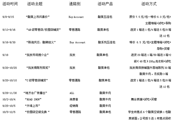 活动之前的备货过程中由于产能不足无法满足需求,五连包仅110箱。公司企划建议我们延后执行。但是通路有它的自然属性,特别是对于一支新产品来讲,我们只能顺水推舟的小心呵护。一旦打乱了上市的顺序必然会影响到产品在通路上的回转,也会给营业人员造成更多的困难;倘若竞争对手抢在我们之前发动进攻:卖场买断陈列、通路拉高库存……,必然会增加我们销售的困难,也一定会付出比现在多得多的投入。思考再三后,我决定按即定时间上市。定下计划后一切就显得顺理成章了:五连包不够就用单包捆绑贴上条码,酸菜赠品不够就用其他口味的赠品……