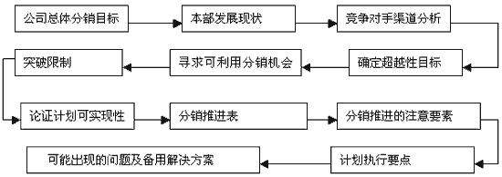 从分销流程图上可以看出,分销计划在公司总体分销目标的基础上,要求用更为周密而详细的细节性计划来支持总体分销计划目标,确保分销总体目的的可执行性。比如公司年度的分销目标是1000万元,那么在各部进行分销计划的制定过程当中,就应当以此为目标,并根据当地实际情况,把可实现的目标落实到位。