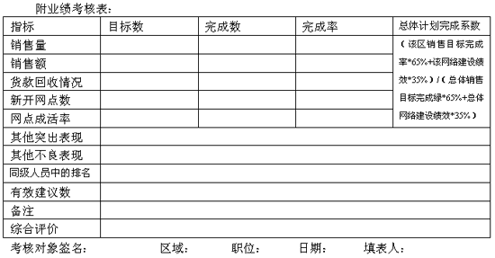 ★功过分明 绩效考核是个让人头疼的工程。有的公司把绩效考核当成了吃大锅饭,人人都有份,人人都一般。考评的内容也是五花八门,营销人员既看不出自己的能力和不足也不了解考核的标准和条件。能量化的东西很少,主观的东西太多。笔者认为考核抓住两个方面就很好了。一是业务能力,二是对公司的忠诚度。现将我公司的业绩考核表(见下图)贴出来,供大家参考一下:
