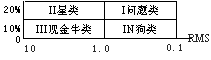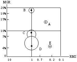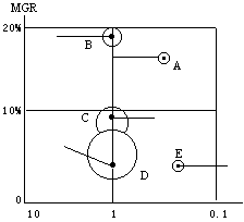 其中,<1><2><3><4>为市场调研得来的数据。根据上表<1><3>项的数据,可以算出公司的相对份额<5>,根据<1>及其合计数可算出本项业务占总业务的比重<6>,具体数值列于上表,并将其反映在“增长——份额矩阵”中,见下图: