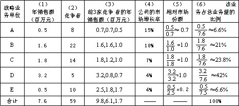 一般而言,对第1类业务可采取发展策略,第2类可采取维持策略,第3类业务可采取收获策略,第4类可采取收缩或放弃策略。 下面通过一个实例来说明如何用该矩阵来评估业务发展策略。 设某工业设备公司由五个战略业务单位组成,企业及市场的有关数据如下表所示,试分析公司的经营状况及其未来决策: