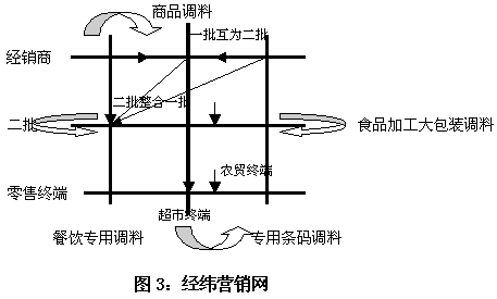 二、纬线 1、一批互为二批,二批整合一批 一批商无论窜货还是乱价,根源都在于库里的商品营销不出去,下线无法实现商品下泄。面对此种情况,厂家业务人员该做的应是协助经销商建立二批营销网络,一来确保商品向终端流通,二来可以确保渠道资源掌握在企业手中。 厂家业务人员应每日拜访二批商,了解市场动态,传达促销政策,及时总结,迅速调整。同时厂家业务员应带领经销商、二批商签订厂家、经销商、二批商三方合同。合同限定经销商经销调料品类(一条经线),对于其它品类无经销权,但可作为该品类经销商的二批商;而各二批商只能到指定的经销商处拿取指定品类的货物,但可以到负责不同品类的经销商处拿取不同品类的调料。一批被限定了经销品种,所以考虑的则是怎样将产品推到下线;二批签订了三方合同,只能在指定的经销商处进货,为了既守规矩又显灵活,所以只有帮助厂家整合一批。这就形成了一批互为二批,二批整合一批的自律局面,厂家则在其中负责过程维护。 2、第三纬线,扎根终端 销售的最终目的是销售终端。二批商整合一批后拥有了资源整合的优势,可将多个品类一同销往零售商;零售商得到了整合后的资源,便有更多的优势面对市场和终端消费者。而零售商多个品类“捆赠”销售后,有机会集合小利润形成大利润,对于单个品类,消费者则又有机会获得更有竞争优势的价位。三条纬线,各得其利,相得益彰。 需要特别说明的是,现在的零售终端有一支特殊的力量不如忽视:超级市场。超市同样作为零售终端,但是它帮助我们厂家铺好了销售渠道,整合了多种资源,提升了产品品位,彰显了真实质量。因此,超市需要一支实力强大的供应商队伍,他们要靠赚取的利润承担超市高额的通路费用。商品调料是我们力推的品类,经销商品调料的经销商应直接负责超市终端,力保产品品牌优势,维系产品利润空间。 三、经纬营销网