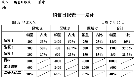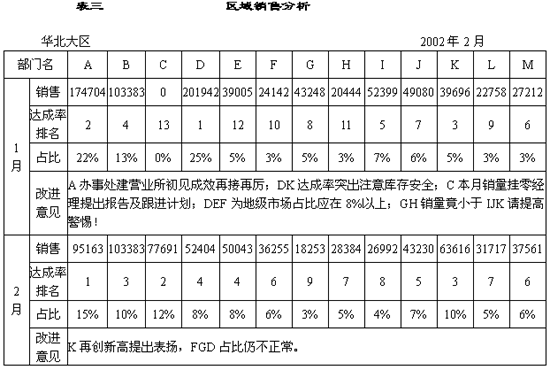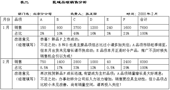 大区经理下设办事处分公司十几个区域市场,要想提高工作效率必须建立数据分析体系,帮助大区经理直观清晰全面地了解和分析各区销售情况。销售数据的分析系统包括两大方面:其一是实时监控,使大区经理每天可以通过简洁的数据反映掌握各区的销售指标是否正常,建立预警机制,在销售危机刚萌芽时就能及时应对;其二为月度分析,每月大区经理对属下各区的销售数字进行分析,客观公正地评价下属业绩,导入竞争机制,同时引导各区经理不但关注销售数量,而且关心销售质量(全品项销售、安全库存、重点产品推广等)。 示例: 销售分公司独立掌握人、财、物权力,管理得当就是有力的销售工具,管理不当就是最可怕的销售危机。对销售分公司的监控不仅要做到随时了解销售数字、达成率、品项占比,而且要随时了解该公司的库存、客户欠分公司的欠款以及分公司向总公司的缴款状况,对分公司库存品项不全或品期、分公司滥用赊销权造成客户欠分公司欠款超过公司规定标准,以及分公司不及时向总公司缴款等异常现象,力争做到当日发现、当日跟进,及早处理,避免出现问题成堆、恶果已然酿成的局面。 当日销售:3万元;当日回款:1.8万元;当日客户欠款:1.2万元;当日回款率:60% (每日填); 月累计销售:40万元;月累计回款:37万元;月累计回款率;92.5%(每周一填); 客户月累计欠分公司应收款:3万;月累计分公司从总公司提货金额:50万(每周一填); 月累计向总公司缴款:38万;分公司月累计欠总公司货款:12万元(每周一填)。 实际操作意义示例: □ 该分公司至目前品项出货占比不正常;品项3占比太小. □ 目前该分公司总库存数字1250件,对比其在7月10日前 一周的销量1050件,库存数太小(公司要求安全库存为周销量的2倍),要督促分公司屯货。 □ 品项2的库存只有200件,远低于上周销量,要督促分公司尽快补货。 □ 品项2有15件即期品还有60天过期,需拨促销费用消化。 □ 该公司一直以来客户回款率较高(92.5%),但7月10日当天回款率只有60%,出了什么问题?需及时和分公司经理沟通了解情况! □ 该分公司目前客户欠款只有3万,但分公司欠总部的款高达12万!出了什么问题?要马上追查! B.帐款日/周报表 欠款数目越大,时间越长,追讨的可能性越小,控制应收帐款的通用原则是对赊销客户设定信用额度和信用期限。每次在客户下订单发货之前,审核该客户的累计欠款是否超期超限,对超期超限的客户停止发货。——销售总监可以对特殊客户(如:重点商超等)或特殊情况(如:客户已回款但货款在途),特批放行 ,每天/周销售结算人员将当日/周发生的异常欠款(即超期超限)的订单绘制成日报表/周报表抄送总经理、大区经理、销售总监。 实际操作意义示例: ——业务员和销售主管的心理压力:我的辖区客户出现异常欠款当天领导就知道了,从那天起领导肯定一天一个电话,逼问我这笔货款的追收情况。 ——销售总监和大区经理的心理压力:我的辖区客户出现异常欠款,虽然我有权特批放行继续发货,但这些数据总经理天天都能看到,我的部门异常帐款多,即使对这些客户及时停货,老板也会认为我管理不力,我特批放行的帐款更要确保能早日收回,否则老板又会给我带上滥用签字权的“帽子”。 ——异常欠款当日曝光,当日检点,当日追究,从上至下形成对应收帐款追讨的巨大压力。层层压力之下,就会层层加起小心,层层负起责任,漏洞就会减少,效率就会提高。 二、销售数字的月度分析 大多数企业销售月会上对销量的检点停留在只追究各区域销量达成率的层次上,实际上仅靠销量很难客观评价一个区域的销售贡献(各地市场规模不同,市场基础不同,存在很多影响销量的“先天”因素),达成率也不能公平反映销售人员的工作质量(没有一个总监能熟知各区市场状况,订出绝对公平的销量任务)。 对于一个大区经理而言,简单地根据销量和达成率考核各区工作没有意义,重要的在于你能引入公平的评估模式,让各区域的主管和经理感受到压力而且心服口服。 完备科学的月销售分析要达到以下目的: 1、析整个大区的当月销量、同期增长率、较上月成长率; 2、导各分区经理关注自己的出货品项占比是否健康; 3、引导各区特别关注当月公司重点产品的销量; 4、排除市场容量不同、市场基础不同、任务量不合理等因素的干扰,客观公平地评估各区的销量贡献。 作用:◆ 清晰反映整个大区今年的各区销售走势、今年销量与去年的成长对比; ◆ 对相较去年同期销量有大幅成长或衰退的销售数字形成鲜明的展示, ◆ 引导各区销售经理对异常销售数字,做出备注和差异说明。 背景说明:A为暑季产品,元月份应着力铺货启动市场迎接旺季; BCD为该公司主要产品,其中C为拳头产品; E为年间礼盒产品,2000年元月过春节,如果元月E品项推广及时应该会有好的销量; F为新品上市; 北京办事处六月份刚转为分公司增设车辆、库房和业代。 用法:如上表所示,每个月的月会前,内勤对各区域当月出货品项占比进行数据分析,大区经理审阅并填写意见,对其新品推广、全品销售、产品换季的及时准备、时令产品销售等各种品项占比要点进行点评。月会时宣读此表并发给各区域传阅。 实际操作意义示例: (1) 各区主管都可以从这张表中大区经理的评语中学到营销思想 如: □ 要关注全品项销量,尤其是公司主打品项(元月份北京办B、D