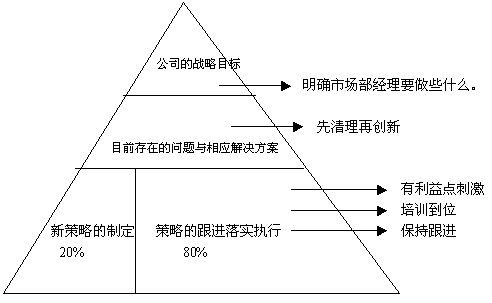 Marketing Manager,一个金灿灿的名字,一个成就光荣与梦想的职务,一个最大化展现年轻人才华的职务,一个激情飞扬的职务。 明确思想之后就是行动了。 第一步往那里动? 直接动产品动广告吗?不,应该是先给自己创造一个良好的工作环境,你的很多工作需要上上下下各部门的同事来协助你,这些部门都是缺一不可的。市场部经理今后所有的计划与设想要付诸实施,都离不开公司内部方方面面的部门与相关人员,欲工其事,必先利其器,树立良好的个人形象,做一个受欢迎的人,才能使你以后的许多设想在大家的帮助下变成现实,可以考虑以市场部经理的职务便利,利用公司资源来建立你的良好人际关系。 个人的工作环境处理好之后,下一步就是进行市场环境的调查了,只有先调查清楚目前所处的环境与现状,了解其根源所在,作出相应的清理与整顿,才能为市场部经理的未来真正动作铺平道路, 在绝大多数公司,老板的要求和现实总有一定的差距,这中间的差距出现的原因是什么,一定要查出来分析清楚,有一点可以明确的是,一般来说,种种问题与现象,内部因素要占大头,至于外部市场因素及竞品因素要占小头,而内部因素又大多出在执行力上,执行力的问题就是人本身的问题,人本身的问题又往往出在利益点上,这里所指的利益点,可不仅仅是工资与奖金,而是情绪,技能,发展,都是利益点。 毛主席说的好:没有调查就没有发言权,解铃还需系铃人,光从现象是判断是无法了解事情真正的原因的,必须要深入到基层员工中去,与他们打成一片,融合成一片,从中来了解问题的根源,与员工来共同分析问题,鼓励员工提出解决建议。市场一线员工最讨厌总部领导下基层摆架子,那就别指望能听取到什么有用的信息。而认真倾听员工的意见与建议,本身也是对员工的一种鼓励与信任,也更加能确保以后市场部出台的新方案被员工有效的接受与执行 了解到目前存在问题的根源后,,下一步就要进行已有问题的解决,不管是要通过疏导来解决的,还要通过调动资源投放的方式来解决,总体而言,解决问题倒不是很复杂,关键是怎么说动老板,这里有个小技巧,在提交给老板整套的问题分析研究情况及相应解决方案中,必须突出现有存在问题发现下去后对公司战略的损害(吓吓老板)还要要着重让公司决策者看到解决之后的收益(哄哄老板),争取老板的认可与投入。 清理好现有问题之后,下一步就要开始制定新的策略方案了,也就是要体现市场部经理的真正价值,展现出市场部经理创新思路,新策略的制定一般要考虑如下几个因素: 老板及公司的未来发展目标 公司目前的资源与现状 前期发生问题事故的前车之鉴 该计划所计划达成的效果 各层面人员及相关部门的关连利益点 考评稽查机制 具体的策略制定切忌坐在办公室里干想,而是要来发动群体共同参与,一方面是个人的思维能力毕竟是有限的,考虑问题很难说能兼顾到方方面面,发动群众来集思广益,将方案的可执行性尽可能放到最大化,取之于民用之于民嘛。另一方面,让员工参与市场部的一些工作,让员工的思想融入到市场部的工作中来,真正意义上的尊重员工。这对提高员工的后期成型方案的响应性和执行性会有个很大的帮助。 新的方案完稿之后,切忌直接颁布实施,最好是进行小区域试行,确认有效,获得公司管理层的认可后再行推广。虽然时间上会拖延一些,但能确保效果。另一个方面,老板所能给予的计划资源永远是有限的,永远是僧多粥少,在没有看到兔子之前,是不会撒更多老鹰出来的,如果将已有资源进行平均分配,就是撒胡椒面,东南西北都各撒一点,可以到头来一事无成,落的个四处抱怨,与其这样,不如将有效的资源与精力集中投放在一两个市场,将有限的资源进行重点投入或者是轮流的重点投入,撒胡焦面的做法切不可取。 其实,制定策略并不会很复杂,而大头在后面的具体落实执行上,一般来说是个二八开的比例(策略制定20%,具体落实执行80%),任何方案策略都需要具体的人去执行,往往是越到基层对执行力的要求就越高,我们考评一个团队的价值的时候最主要的就是来看这个团队的执行力, 具体落实执行就需要执行力的保证,这个保证从那里来?关键点在这三方面: 一是利益点设定; 二是培训到位; 三是跟进工作到位; 在新策略的实施过程中,相关的利益点设定相当第一重要,新产品投放或是新的营销策略的执行,都需要基层员工付出更多的努力和汗水,就得有额外的绩效考核制度来配套,缺少这个利益点的刺激,那么基层业务人员的对新策略新产品的积极性难免就会小很多了,甚至视作负担,这也是许多企业新产品推广失利的主要原因。 一种新营销策略的起用或者是新产品的投放,员工必须有效的领会企业意图和理解产品概念。才能有效的转化在具体行动上,新概念或是新产品首先要卖给自己同事,然后才能一级级卖给经销商、卖给卖场、最终卖给消费者。加之中国地广人多,各地风土人情各异,市场也是各有特色,各地的市场状况会迫使当地业务人员对案子进行不同程度的变动,如不进行持续的培训修正,很有可能就会出现方向性偏差,所以市场部还有个很重要的工作就是培训,持续的培训,不间断的培训,确保概念理念传输到位。确保理解到位,杜绝跑偏。 持续的后期跟进,在具体的操作过程中,各分支机构难免会出现些进度延误和精力松懈的