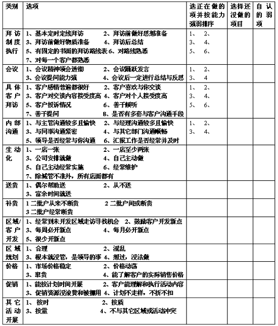 在管理理论研究近年来并没有太大的进展的情况下,许多学者开始对执行力进行关注。在市场环境越来越复杂越来越难统一的情况下,许多管理者也对下属的执行力提出了更高的要求。执行能力的提升,最快最直接最全面的提升靠什么,大家都会异口同声地说:培训!所以,许多企业在这方面似乎表现出了前所未有的需求,很多培训咨询公司也趋之若鹜地去迎合企业的培训需求,这块市场,宛然一块黄金市场,炙手可热。 二、执行力培训必须要让员工和管理者知道执行力的弱项在哪,欠缺或者还没实施的执行力在哪? 通过以上这张表,小阳对这次执行力培训有了底,虽然业务拜访能力、客户沟通能力等是执行能力的总结,但后面的细节却都是按照一线员工的实际工作而进行的细化。于是,他将此表先打印出来,去征求老总的意见。没想到,老总直说“好!好!我一直也在想如何提高一线业务员工的执行能力,这,非常之有针对性啊!如果通过此份表格,能将他们的弱项表现出来更好。知道执行力包括哪些内容,知道他们在哪些方面还有短处,这样我们都知道改进的方向在哪,这不更好吗?你回去想想,可将其内容丰富一下。” 阳经理一听,哈哈,正合我意也!没想到老总没让我讲大道理,跟我想到一块去了。只是,开始对下属公司是否认同完全的“挑刺”没底,这回老总主动提出,正是这次培训的关键啊!培训只讲什么是执行力,并不能达到执行力的提升。如果能讲现在的执行力的具体问题,是这次执行力提升培训的最关键! 阳经理于是找到了大区经理,与他进行了磋商,回来进行了总结,并按能力强弱将各项执行能力进行了详细的分解。以下是阳经理修改后的执行力自检表: 通过这张自检表,迎合一线业务员工在培训过程中可能会进行自我剖析的需要,也迎合了执行力提升最起码的要求:先了解员工现在的执行力有哪些长处可推广和发扬的,执行力的缺陷和不足又在哪里,针对某一个别员工他又在哪些方面需要帮助,培训师需要给予更多的关注和指导。虽然上面这张图没有注明他们的工作责任心强弱,没有体现他们有无创新能力,但表明了最实在的一点:一线员工我们最关注他们的实际的按部就班的操作能力。 三、培训过程通过自检,发现问题,有的放矢地、重点地提出解决有些方面执行力不强的解决办法,真正让员工知道怎样才能提高执行力 阳经理针对上面的自检表,开始着手想在如果某些方面员工做得不好,确实缺乏执行力,应该如何想办法来提高他们。于是,他结合自己的管理经验,结合一些执行力的书籍,他又针对性地撰写了一些解决方案,供培训现场进行研讨和解决。 培训开始了,小阳已对这次培训已胸有成竹,并请来了一些相关领导在培训的同时,适时给予指导。尽量将其由一言堂式的灌输变成一个有员工热切参与的研讨会,并通过研讨,将大家的热情全部发挥出来,从而将大家平常尽量隐藏从而总部很难觉察的一些问题发掘出来,获得一次珍贵的发现问题、找到解决方案的机会。 在作了一些开场白后,阳经理首先作了一个简单的定义,并简要说明了执行力提升的重要性,同时还强调了在执行过程中发挥主观能动性的重要性。 然后,他开始简要地对该部门一线员工执行力进行了概括。 最重点的一步到了,小阳将复印的自检表拿出来,人手一份,开始逐项进行讲解。然后,让员工开始进行自我评判,对自己的执行能力排序,然后找到自己还没做的项通过自己对自己的检讨。员工由于一直在前线拼搏,很少对自己的执行力进行过评价,看到这样一个自检表,觉得是一个很好地对自己进行评价的机会,也好让自己总结一下,与同事对比一下,与公司的要求对比一下。他们还发现自己的执行原来也这么系统,并且有些方面确实还没有做过,有些方面努力执行了,却没有做好,有些方面确实需要给予帮助,虽然一直想提高,但好像一直没找到很好的办法。 他们都非常认真地对自己进行了一次执行力的彻底的评估。 利用休息的时间,阳经理快速地将这些自检表进行了一次汇总,得出一张汇总表,然后将汇总表的结果进行了总结。哇,不看不知道,看来每个员工都还有一些迷惑的地方,还有一些弱项!同时,整体上来说,整个部门还是存在一些执行力不强的问题,还需要改进和提高。看来,他开始准备的具针对性的解决方案真面目要派上用场了! 以下是阳经理做的汇总总结: 1、总体来看,拜访制度、具体拜访、内部沟通都还存在一定问题。区域规划不明确以及开展活动的时间性存在改进之处。 2、具体如下: A、虽都认为自己对路线熟悉,但大部分存在无固定拜访路线表,并且大部分对客户不完全熟悉,拜访不按时按路线,随意性较强;拜访前的准备与拜访后的总结也需要加强; B、与客户交谈时,只说,不善于提问;与客户沟通手段单一不全面; C、普遍存在与其它部门沟通受阻的现象; D、生动化较好,但也是公司安排就做的居多,主动性还不强; E、开拓能力需要加强; F、存在一定的窜货现象; G、开展活动的时效性不够。 通过以上得出的执行力的存在需要改进的项目,阳经理抓紧时间,理清一下思绪,赶快制定了一个下半时段的培训重点计划,这也是下一步需要提升的执行力的重点: 一1、执行力重点:拜访制度的尽快形成,使大家更加作好拜访前与后的准备与总结;同时在熟悉路线的情况下尽量按时定线拜访,并加强与客户的熟