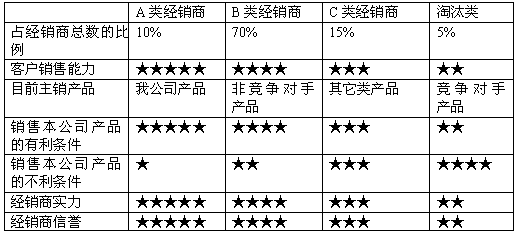 在对经销商的管理上我们的区域经理常常会走极端,要么管理得太松,使公司产品、政策被经销商玩弄于股掌,该给二三级经销商的返利不给;企业投入的促销品也挪用到其它品牌上;或者不执行公司的产品定价,甚至低价“窜货”等。最严重的后果就是出现呆帐坏帐。另一个极端是管理太紧,让经销商缩手缩脚不能有效发挥经销商的主观能动性。 如何有效管理经销商?首先要重视对经销商的管理,并在管理过程中采用系统性的策略规划和技术手段。 在金庸先生的《天龙八部》中,六脉神剑是古大理王国皇家祖传神功,运剑于无形,剑招虽少却独步武林。为了本文的通俗性,笔者就如何有效管理经销商的话题为大家逐步分解这旷世神剑的奇招妙术。 第一剑:少商剑 出剑的第一招很重要,它为紧跟后面的招数开路。在对经销商的管理上我们首先要清楚我们该管谁,该重视谁,谁最值得管。因此将经销商分为三六九等是我们管理工作的第一步。如何分清这重点与非重点的区别,笔者通过表格的形式为大家展示出来: