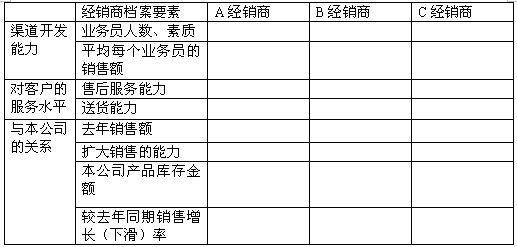 通过对上表的分析,我们就能很快确定谁是真正需要我们和我们需要的经销商了。这就像谈恋爱找对象一样,对像找准了,才会有持久幸福的婚姻。对象一旦确定就要看我们的表现了。作为区域经理我们要做到让A经销商非常满意,让B经销商满意,让C经销商比较满意至少是没有怨言。对于该淘汰的经销商我们只有放弃。 第二剑:商阴剑 剑侠的第二剑是紧跟第一剑的。区域经理一旦确定经销商后跟着就该建立经销商档案。经销商档案就是将经销商的各项资料归纳整合,为公司的渠道决策提供参考的依据。我们有些公司也为经销商建了档并且保存的很好,这些所谓的档案资料仅仅记录了经销商的名称、电话、地址、帐户等一些死的东西,对我们的决策所起的参考作用很有限。笔者认为除了记录经销商的基本情况外还要增加一些动态的资料,如下表: