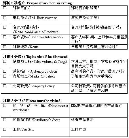 本公司是一家世界知名的的建筑材料制造商,在世界各地有100多家工厂,在中国也有其相当规模投资的工厂,国内所有产品均通过各地经销和分销商进行销售,其中大众化产品(销量大利润低)主要由经销商网络销售,而高技术产品(高利润销量相对低)则由厂家销售代表通过拜访工程(项目业主,设计师,总包/分包)获得订单仍交经销商操作。 工作中发现,销售代表在拜访经销商中较普遍存在拜访目的不明确,走马观花,拜访效率低下等现象,为强化队伍管理和有效的拜访,以表格化为销售代表设计工作程序细则(见附表)我们概括为拜访5准备4必谈3必到。 首先销售代表出发前须问自己5个问题,往往一些小问题如没有电话预约或样品/资料不齐备会使拜访打折扣,如由于拜访前没有 预约等到了客户处才发现客户临时外出了,白白浪费了半天时间,这类低级错误有时也会发生在有些老的销售代表身上。同时有些销售代表不能有效的按排拜访路线而使在途时间大大超出工作时间,所以销售代表的周工作计划必须与其主管讨论并获批准。 拜访中与客户七拉八扯,漫无边际是销售代表易犯的另一个错误。 表格中我们规定了4个与客户必谈的问题,简单而明确也节省双方的时间。如每次拜访销售代表必须强调公司的高端产品给客户带来的益处,因为经销商总是乐意销售价格低市场容易接收的大众产品,而对一些高端产品则由于价格高和对产品特点不了解,态度较消极。拜访的目的就是通过培训提高客户销售这类产品的兴趣和销售技巧。另外客户的销量和目标是不得不谈的主题。 强调拜访三个必到的地方,是为了避免销售代表作蜻丁点水式的拜访。客户的销售网点主要检查公司产品的陈列情况。而从客户的仓库可以了解其从工厂订货后的实际销售,销售同类其它产品比例。工程拜访是销售代表销售高端产品的最好途径。 拜访结束销售代表向其主管递交本次拜访报告。