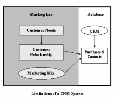 图1对目前流行的CRM系统的缺陷作了详细的描述:它错误地把客户行为定义为客户关系;它只关注数据库中的数据而忽视其市场竞争以及市场的潜能;同时它还忽视客户真正的需求而只关心数据库中购买行为的相关性。 |