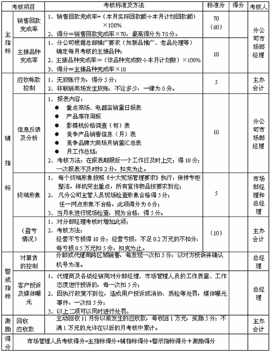 ★注:对分部经理考核时增加一项“盈亏情况”考核,得分为10分,此时“销售回款额”的得分调整为60分。