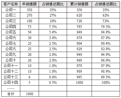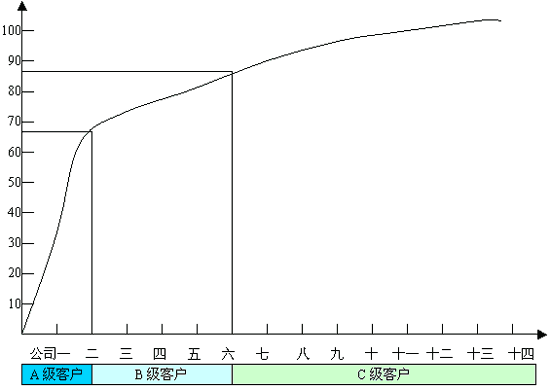 客户ABC的分析方法 “客户”!我就要将你分级!! -------------------------------------------------------------------------------- 中国营销传播网, 2002-05-28, 作者: 安福民, 访问人数: 2595 从理想的CRM角度说,企业应该用同一标准对待所有客户,不应该存在把客户分为三六九等,区别对待,而现实情况恰恰相反,企业经营的目的就是赢利不是在做希望工程,所以必须将客户按价值分成不同的等级和层次,只有这样企业才能将有限的时间、精力、财力放到高价值客户身上,根据2/8原则他们创造的价值往往是企业利润的80%,只有找到这些最有价值的客户,提高他们客户满意度,剔除负价值客户,企业才会永远充满生机,事实证明,力图让所有客户满意是不可能的,也没有哪个企业能够做到。至于客户价值的判断方法不同的企业有不同的标准,不在此文叙述之列, 所以“客户们”,我就要将你们分级,区别对待,不同等级的客户拜访频次、客户关怀等级、停留时间、服务支持深浅程度都会不同。具体ABC分类方法如下: 将客户依年度销售额的大小顺序排列,以顺序累计销售额,然后计算累计销售额对总销售额的构成比(见下表),分别以客户名和累计构成比为横纵坐标制图(见下图)。