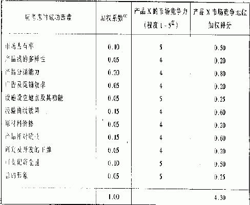 下图为混合系数评价竞争地位及其能力的实例。下表为C.W.Hofer和D.Schendel产品X的市场地位及能力混合系数表。