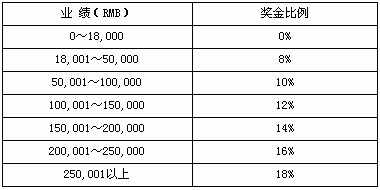 7. 持续奖金:每周举绩15,000RMB以上,连续3周,发放持续奖金1000元RMB 8. 杰出奖金:当月业绩超过10万元RMB,且为上海及北京两地业务人员业绩评比的第一名时,加发杰出奖金1000元RMB 9. 年终分红:当次年农历春节仍然在职者,可领取年终分红。年终分红的额度为个人全年业绩的百分之二 10. 业绩定义: a. 当成交价等于定价时,业绩以成交价的百分之百计算 b. 当成交价不等于定价时,业绩之计算方式由市场部主管会同总公司财务部精算后决定 c. 开拓经销商及代理商业务,不列入业绩计算,酬佣办法另订 d. 受理业绩:当财务部接到客户订金?quot;整笔订单业绩额" e. 核实业绩:当财务部接到客户尾款之"整笔订单业绩额" 11. 酬佣之计算均以核实业绩计算 二、 考核:(核实业绩) 1. 业绩考核:每月基本业绩考核额度为18,000元RMB 2. 工作考核: ⑴ 差勤考核:须按公司规定办理。 ⑵ 活动量考核:a.每周拜访量不低于13个(拜访量是指与客户面对面之销售约会的次数) b.每日电话拜访数不低于20个 ⑶ 行政工作考核:业务人员须按时且确实填写业务报表(含:活动管理表、客户资料表、电话记录表、潜在客户名单) 3. 合同的维持: