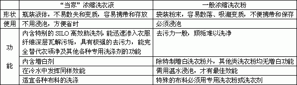 “当家”浓缩洗衣液与一般浓缩洗衣粉的比较: