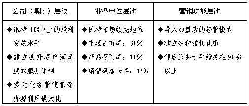 四、年度营销目标设定举例 下面,笔者列举一些定性的、定量的目标供读者参考: 1、定性的年度营销目标 1) 维持10%以上的股利发放水平 2) 销售额增长率:15% 3) 市场占有率:30% 4) 产品获利率:10% 5) 售后服务水平维持在90分以上 2、定量的年度营销目标 1) 建立提升客户满意度的服务体系 2) 保持市场领先地位 3) 营销渠道多样化 4) 持续提高企业的绿色营销形象 5) 导入加盟店的经营 6) 多元化经营使营销资源利用最大化 可以将上述目标分别归类于总公司(集团)层次目标、业务单位层次目标及营销功能层次目标(共3类),如下图所示: