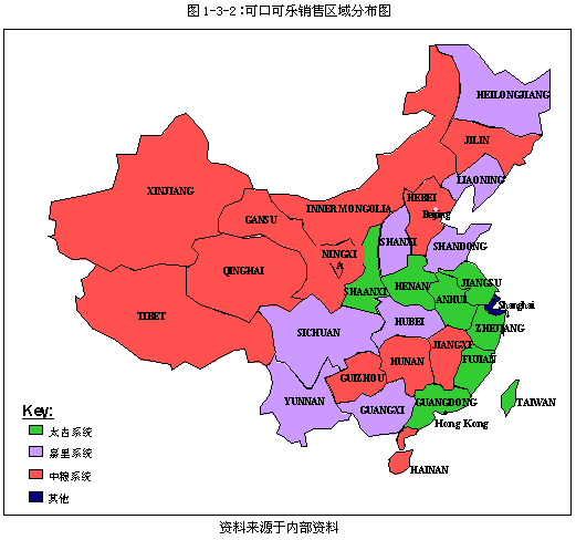 ![]() 三. 可口可乐公司在中国的发展战略: 与其全球发展策略一致,可口可乐公司在中国的发展策略同样是“本土化”战略。 作为全球性的企业,本土化战略本身并无什么新鲜的,但像可口可乐公司这样将本土化战略展开得如此坚决和彻底的则并不那么多见。2000年,可口可乐将中国区总部从香港迁移到了上海,从而为更近距离的感受中国本土的气息创造了条件。同时,可口可乐在人才的使用和提拔上面也同样加快了本土化的步伐。2002年,首次任命了三位中国本土人士担任副总经理。在加快内部管理本土化的同时,可口可乐在营销工作方面的本土化工作也在不断强化。例如,近几年,可口可乐通过春节期间的“阿福”包装及十二生肖将可口可乐与中国文化巧妙的融合了起来。 四. 可口可乐公司在中国的发展策略: 首先,特约装瓶商系统是可口可乐公司实现其中国市场目标的主要策略。 至2003年,可口可乐公司已经投入10多亿美元资金与其三个主要的特约装瓶商,太古、嘉里、中粮合作一起在中国建立了23个装瓶公司,28个生产厂,基本覆盖了中国所有的省份。可口可乐公司选择的合作伙伴都是国际化程度较高、具有比较先进的经营及管理理念并且企业战略相进的集团公司,从而保证了双方在合作的过程中能够更好的达成共识,实现“共富”目标。