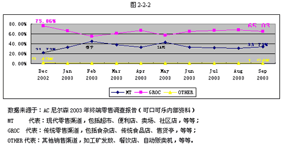 二. 中国市场的营销渠道特点: 从零售渠道和中间商渠道自身的角度出发,分析营销渠道的特点如下: 1. 中国日用消费品市场的零售渠道具有两个显著特点。一是计划经济时代占据市场主导地位的渠道,如供销社,已经被彻底打破,中国零售市场正处于快速发展的关键历史时期;二是现代零售渠道近年来虽然获得了长足的发展,占据了越来越多的市场份额,同时传统零售渠道(如食杂店)依然占据着市场的主导地位,即使是在经济水平较发达的多数东部沿海城市中。以A市为例,2002年12月到2003年9月期间终端零售渠道非碳酸类饮料产品(不含乳类饮品)的市场销量份额见图2-2-2。