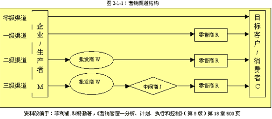 根据产品从生产者到目标客户或消费者需要通过的流通环节多少的差异又可以区分营销渠道的长短。我们通常用中间机构的级数来表示渠道的长度(见图2-1-1)。 1) 零级渠道,就是以上提到的直接渠道,是由生产者直接销售给目标客户及消费者。(M-C) 2) 一级渠道包括一个销售中间机构。(M-R-C) 3) 二级渠道包括两个销售中间机构。(M-W-R-C) 4) 三级渠道包括三个销售中间机构。(M-W-J-R-C) 以此类推,销售的级数越多营销渠道就越长。不过,就消费品而言,间接渠道主要以三级渠道以内为主,因为,渠道的级数越多控制的成本和难度就越大。