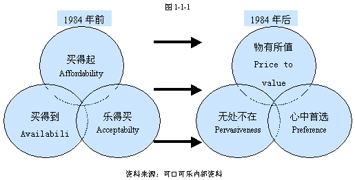 三. 可口可乐公司的基本策略 可口可乐公司将其基本的策略概括为六条,并按照先后次序排列如下: 1. 以可口可乐为首,加速碳酸饮料的增长; 可口可乐是可口可乐公司永恒的主题,也是其企业赖以生存的基础,因此,维持可口可乐及其类别碳酸饮料市场基础的不断扩大是其公司的首要策略。 2. 选择性地扩大我们的饮料品牌系列,以促进利益的增长; 现在,可口可乐公司正努力向一个全面型饮料公司的方向发展,而不甘心仅仅是碳酸饮料的提供者,因此它在保持有效盈利的前提下,在全世界范围内不断扩大它的饮料系列,不断地开发新的饮料产品。仅在2000年,可口可乐在45个亚洲国家推出了15种新饮料品种。 3. 与装瓶伙伴共同提高产品体系的盈利率和生产率; 特约装瓶商系统是可口可乐公司实现其全球化目标的主要手段之一,因此,关注并维持其装瓶伙伴的运作状况,也是保证可口可乐公司自身利益的重要内容。 4. 以创新及一贯的精神待客,以求在各方面共同增长; “共富”思想是可口可乐公司的基本哲学,也是其能够成长为全球企业翘首的内在因素之一,而创新则是可口可乐公司实现“共赢”的主要手段。 5. 把资金投放于各市场中最具潜力的领域; 6. 在各方面提升效能和经济效益。 四. 可口可乐公司的营销策略 长期以来,可口可乐公司奉行营销三环,环环相扣的策略(见图1-1-1): 1984年以前,三环代表的是3A,买得起、买得到和乐得买,其中:买得起(AFFORDABILITY):是要求可口可乐公司产品的零售价格适当,确保消费者能够买得起; 买得到(AVAILABILITY):是要求可口可乐公司产品的市场铺货率高,确保消费者只要想买,总能够买到;乐得买(ACCEPTABILITY): 则是力争使得消费者接受并喜欢可口可乐公司的产品,乐于购买并饮用它。 随着市场及消费者消费特点的发展和变化,1984年,可口可乐公司依据销售实际并结合公司条件,将营销策略由3A发展为3P,物有所值、无处不在、心中首选,其中: 物有所值(Price to Value):是要求可口可乐公司的产品不仅消费者有能力购买,而且必须力争使消费者获得的回报价值符合甚至超过他的付出。无处不在(Pervasiveness):是要求可口可乐公司的产品必须渗透到市场的每一个角落,使得消费者能够在任何时候、任何地点都可以方便的购买到。心中首选(Preference):则要求可口可乐公司的产品不仅能够被消费者喜欢和接受,而且要力争占据消费者的心志,成为其首选产品或品牌。