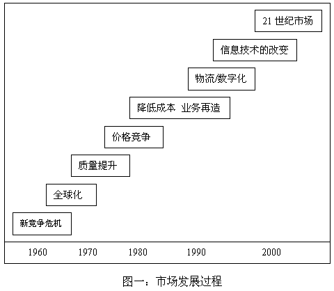 这一时期也是现代营销理论和方法形成和完善的时期,也是麦卡锡(1960)提出的营销4Ps(即产品、价格、分销和促销)的时代,是由不断增长的消费需求来驱动经济增长的模式。企业间很少存在竞争,基本上没有价格对抗,生产者统治市场,他们所生产的产品都是好的。消费者要做的则是在几乎任何情况下,在拥挤的人群中,以几乎任何价格去购买几乎所有的东西。 60年代早期,美国制造工业的竞争者又开始出现。德国、英国、法国、日本及太平洋周边地区的“五虎”开始成为其强有力的竞争者。他们以比美国更快的速度、更好的质量及更低的价格生产产品,并迅速采用了美国企业的营销方法——运用那些在美国市场上十分有效的营销理论和方法,并且不断的加以改进。他们提出了全球化的概念,不再满足于他们的国内市场,而是迅速出口到其他国家去满足看起来似乎永远无法得到满足的顾客和消费者的需求。全球化由此开始并取得了成功。 60年代中后期,日本运用戴明、朱兰和其他专家的概念和原理,改变日本制造业的范式。他们从“将产品送出工厂并在他们出毛病时进行维修”的模式转变到“以更具竞争力的价格生产更好质量的产品,而后坐观消费者纷拥而至你的品牌”。(戴明,1982)。事实上他们确实是这样做的。首先是在汽车行业,接下来是电子、钟表、照相机行业。日本企业不断提升产品质量水平并赢得一个又一个市场。许多营销专家不能理解这种变化。他们继续以他们乐意的方式制造产品,根据生产成本进行产品定价,通过传统的渠道进行大量分销和媒体传播,并在产品出问题时再去维修。 70年代末,产品生产终于能够满足消费者的需求。即使是在市场快速增长的亚太地区、欧洲甚至是北美地区,日益增长的全球制造能力已超过了消费者的需求,生产已经过剩。当生产的产品大大超过消费时,大多数企业做的时同其他所有企业一样的事——降低价格和减少利润。仅仅几年前还有巨大赢利的企业的利润开始萎缩。在财务分析家和股东季度赢利期望的压力下,公司开始使用短期、增加销量的营销工具——如销售促进、商业折扣、直邮材料等来吸引消费者。 多数情况下,这些活动增加了当时的销量,但这是以削弱通过多年努力建立起来的品牌价值为代价的。在这个过程中,产生了竞争营销传播专家——通过专家来改进公司的资金、管理、职业等来参与竞争。 1987年美国股票市场发生动荡后,公司开始对成本给予充分的关注。许多组织发现自己很臃肿,并开始削减成本。这使得组织得以收缩,组织收缩又导致了裁员和临时下岗。尽管成功者非常有限,事实上,多数组织在二十世纪80年代中期和90年代初期在规模收缩、流程再造、提高效益的管理方法上花费了大量的金钱和时间。在极大程度上,这个时期的工具和技术的重点都在改进成本结构上,却极少能提供能增加收入的东西。尽管全面质量管理之类的理论提出以顾客为中心(当然是正确的),但在我们眼中,这些理论只是关于基础的经营运作,没有提供足够的工具来合理分配有限资源并抓住商业机会。 由于注重流程再造、成本削减,许多组织对其营销传播努力只作了零星的改变——如分配资金到各个业务单位,将资金从传统大规模的广告转移到更加专业的媒体和目标明确的促销工具上,各种新的营销传播形式(例如事件营销,相关目标营销,关系营销等等)开始出现。到二十世纪八十年代末,顾客商品速递组织(FMCG)将百分之七十多的营销资源分配到促销和其他“线下”活动中。 随后,最大的变化发生了——“数字化”及“物流”在二十世纪八十年代得到了快速发展和利用。多数业务活动都采用了由计算机处理的数字形式,以此降低了发展的时间和成本、生产时间和成本,上市时间也大幅度缩短,物流和分销取得了长足的进步。组织也学会了如何来获取、储存和管理大量的信息。由于数据可以瞬间从一个地方传送到另一个地方,制造过程发生了深刻的变化——如同分销系统一样。营销组织从生产存货转变为根据顾客需求来生产,整个生产系统的结构发生了根本的、无法挽回的改变。技术也已经促成了服务行业的成长,服务性组织找到了许多方法来完成顾客愿意外包的工作。