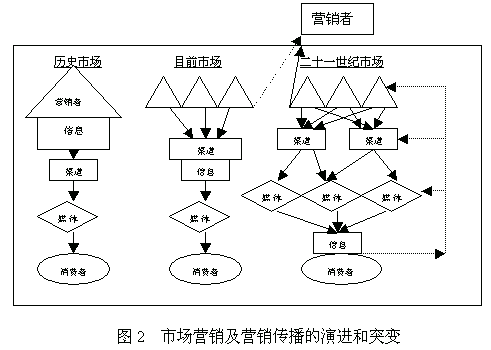 ![]() 正如前文所说的那样,尽管市场已经发生了质的变化,市场营销及营销传播的理论和方法只发生了一点点变化。在图二中,我们描绘了三种市场形式,市场形式随着信息技术的发展而发展。下面,就每一种形式分别进行讨论。 过去的市场形式 所谓过去的市场形式在图二的左边得到了描述。在二十世纪五十年代和六十年代,这种市场形式已经被致力于产品差异化的营销及传播的先锋(如宝洁公司、雀巢公司、联合利华、壳牌公司、飞利浦公司以及其他大型营销和传媒组织等)完美演绎。借助于信息技术,一些组织(如消费者研究机构、大规模分销系统、大型媒体公司等)已经为其差异化产品塑造了著名的品牌,他们一般都成功地用自己的产品占领了大部分市场。一个营销者如果第一个推出干洗店清洁剂,这将会得到消费者相当好的印象,并能满足使用者的需要。因而你能获得大量的资金去占领销售渠道和传播媒体,并且,你还能控制消费者和顾客。以上就是我们所看到的早些年的现代市场营销和传播:咄咄逼人的、拥有专门技巧的营销组织利用差异化的且不易被假冒仿制的产品或服务控制了产品销售渠道、媒体及消费者。
