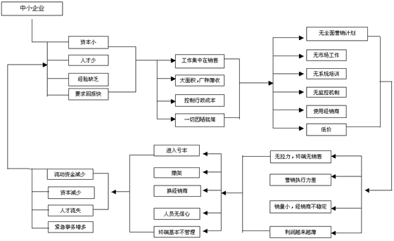 以上的原因及解决办法确实可以解决一部份的问题,在局部销售地区取得一定成果,但不能使中小企业真正解决超市问题,因为这些方法并不能使企业跳出以下的营销负循环(见下图)。