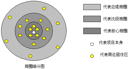 图A商业沿平直街道布置,一面临街,能见度较低;图B商业在街道弯曲处设置,能见度外圈大于内圈;图C商业在“T”形道路交汇的顶头处,能见度也相对较高;图D商业在十字交口处能见度极高,但应注意对城市交通的影响;图E商业在商业街两端有较高的能见度;图F商业在公共广场的迎面处,能见度颇高。 九、商圈的确定和研究 1.商圈的概念及分析目的 商圈是以设定的商业建筑为圆心,以周围一定距离为半径所划定的范围。这是原则性的标准,在实际从事商圈设定时还必须考虑经营业种、商品特性、交通网分布等因素。进行商圈分析的目的有三:一是明确该商业区或商店的商圈范围;二是了解商圈的人口分布状况及生活结构;三是在此基础上进行经济效益的预测。如计划开超市,根据周边居民的人口规模、收入水平和竞争对手情况等指标,就可以基本计算出该店可能达到的营业额。 2.商圈的构成及顾客来源 商圈由核心商圈、次级商圈和边缘商圈(又称辐射商圈)组成。核心商圈的辐射半径在1公里左右。包括这一商店顾客总数的55-70%。该商圈的顾客在人口中占的密度最高,消费的客单价也最高,而且与其他商店的商圈很少发生重叠。 次级商圈内包含了商店顾客总数的15-25%。其辐射的半径在3-4公里,对一般的日用消费品来讲,很少能辐射到该商圈的人口,关键是取决于经营业态。边缘商圈辐射的半径在7公里范围。一般情况下只有大型百货商场、专业店具备这样的辐射能力。如图: