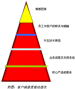 如今的客户可不是那么好唬弄的了,随着市场透明度的增大,可选产品的极大丰富,客户越来越理性和成熟,客户满意度驱动的层次(见附图)也象马斯洛的需求层次一样在不断攀升,要提高客户满意度进而提升客户的忠诚度,就必须使客户满意度驱动的每个层次都做到比竞争对手更好,并能最大限度地令客户满意。下面我将从五个层级来剖析影响客户满意度的因子。
