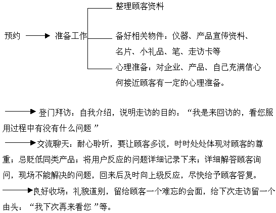 海尔的电器之所以有名,是和它的服务密不可分的,海尔的品牌就代表着高质量的服务,服务成为海尔最好的营销方式。在现代药品和保健品的销售过程当中,注重售后服务成为了一种趋势和必然,有很多同类企业依靠细致而专业的服务,不仅巩固了原来的销量,更是减少了负面消息的影响,因为没有一个产品是100%有效果的。更有甚者把服务作为了一个主流的营销方式,比如近来热起的电话营销、康复营销等等,都是服务的具体体现,不过把服务做到了售前、售中、售后。电话回访和售后走访在这个过程中起着十分重要的作用,细节决定了营销战争的胜利。 电话回访操作纲要 电话回访是销售工作的延续,是针对留有电话的重点顾客进行回访,旨在建立一条顾客与公司之间双向交流的渠道。 一、 目的: 稳定已有消费人群,并使其不断壮大; 获取有价值的信息,及时反映市场动态。 二、电话来源: 1、焦点 焦点集中在发放《售后服务卡》,由营业员或促销人员负责填写,每周上报。 2、市场部 前来咨询的顾客或潜在的顾客均予以登记。 3、电台热线 找进电台热线的听众,请导播予以登记。 4、其它 如社区服务或其它促销活动时以顾客予以登记。 三、操作规范: 1、上岗前应调整好情绪,力戒将不良情绪带到工作岗位。 2、通话时面部应保持微笑。 3、任何情况下都不允许与顾客发生争执。 4、通话时心情要平和,语调要热情,语音要清晰,语言要优美,讲普通话。 5、应争取在最短时间内与顾客沟通好,最好能建立起良好的朋友关系。 6、若顾客是外宾或外地人,更须礼貌周全、热情有加,扩大公司在国外的影响(知名度和美誉度)。 7、对超出职权范围以外的事情,如订货等,不可随意作答,应主动与相关部门联系。 8、回访教程中应严守公司机密,不得泄露。 9、逢节假日,尤其在春节元旦前后,应加大回访力度,代表公司向顾客致以问候。 10、通话完毕,应由顾客主动挂断电话,以免对方有其它情况遗忘。 11、电话回访应及时到位。新开市场应在登记后三天内回访到位,成熟市场应在登记后一周内回访到位。一次回访不到位,列出清单,二次回访,分类落实。 12、电话回访应由专人负责(专家或企划),回访结果详细记录,予以分析总结,及时反馈。 13、电话回访中若顾客问及同类产品,则不可随意贬低,但也不必为其宣传,而应重点介绍我公司产品的特点及优势。 14、电话回访时间若安排在晚上,则一般不宜超过21:00。 四、操作技巧: 1、首句话可以说:“喂,您好。我是某某公司的医学顾问。麻烦您找一下×××好吗?” 2、询问效果时,可以说:“您服用某某产品后,身体感觉好一些了吗?”而不要说:“您感觉怎么样?有没有效果?”前者具有一定的诱导性,顾客一般不会直接给以否定回答。 3、询问病史时,可以说:“你服用某某某产品,身体是什么情况?”而不要说:“您得的是什么病?”应昼避开“病”、“灾”等字眼。 4、顾客询问某某某产品对某种疾病的疗效时,可说:某某某产品可以有效改善××、××等症状。许多类似患者服用后反应效果都不错,您不访试一下。” 5、谈话中要注意有针对性,不同情况区别对待。 (1)若顾客反应良好,可安排定期连续电话或预约走访。鼓励其坚持服用或向他人推荐。同时适当灌输产品知识,培养其成为公司的“编外宣传员”。 (2)若顾客疗效不明显,应详细问明情况,给以合理解释,做好安抚工作。解释原因如下:服用方法不对,疗程太短,用药干扰,个体差异,最后可建议到咨询处或约不定期时间到家中带仪器测量诊断。 (3)若顾客出现不良反应,应首先耐心倾听对方陈述,初步分析出原因,做到心中有数,然后表示此类情况从未出现,可预约时间前往走访或建议到咨询处详细检查。此时我方人员态度一定要诚恳谦让,切忌与对方发生争执。 6、电话回访可配合市场动态,增加暗示性内容,如鼓励礼品消费等,引导舆论,从而引导消费。 7、结束谈话时,可以说“好,这这样,不再打扰了,有什么情况与我们随时保持联系,我们的电话是,×××××××,再见。” 售后走访操作规程 一、目的 走访重点顾客,促进顾客重复购买,消除不良口碑、培养典型案例, 通过良好的服务,发展长期性消费者数量,为市场发展奠定稳定基础,进一步促进销量。 二、基本要求 1、 要有责任心、诚实、吃苦耐劳、有毅力和耐心。 2、 着装整齐大方、精神饱满。 3、 语气亲切真诚、面带微笑、举止得体。 4、 尊重顾客、入乡随俗、礼貌谦和。 5、 必须熟悉本企业情况、产品知识、相对应疾病知识,基本卫生保健常识,同类产品情况。 6、 切实解决顾客的每一个问题,提高用户的满意程度,促成良好的口碑宣传。 7、 争取尽快与顾客达到感情共识,与顾客建立良好的朋友关系。 8、 走访过程中严守公司机密,不得随意泄露。 9、 走访卡的填写 (1)编号:区(县)代码——流水号(三位) (2)首访记录:记录基本内容为患者病症、得病时间、治疗过程、给患者带来的痛苦、如何得知我产品,如何得到我产品、服用后情况。 (3)顾客反馈内容为顾客对我产品的评价、建议和意见。 (4)签名:每次走访由顾客签名、回访责任人签名、由企划部部长或经理复审签名。 (5)同一顾客最好由同一人员继续走访,二访、三访、四访继续记录顾客服用情况。 三、走访程序 四、注意事项: 1、 走访时不允许在顾客家中吸烟、吃水果等,更