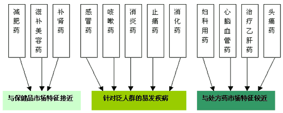 上图表示,消费者在症状较轻或出于保健意识时,基本是在保健品市场中选择购买,当症状加深或一开始症状就较重,大多是在OTC市场中选择购买,当症状进一步加深,肯定是要去医院检查的,那么自然会分成两类人群,一部分是在医生的指导下消费处方药,另一部分或者不严重,或者是慢性病,那么将回归到OTC市场消费。 (二)OTC市场特征分类 正是由于存在着这样的消费者医疗行为,决定了OTC药品市场实际存在着三大块。一块是倾向于保健调节的市场,与保健品存在着市场竞争;OTC最主要的一块是面对基本进行自我诊断的常见疾病的市场,如感冒、咳嗽和简单的皮肤炎症等OTC市场,泛人群的相关认知比较全面,市场运作有了成熟的认知基础;还有一块则主要是面对一些长期的、慢性的较难快速治疗的疾病,市场相对细分,泛人群对此认知较浅,主要是针对固定的慢性病的消费群,如头痛、心脑血管、关节炎等OTC市场,因此和处方药市场有所争夺。