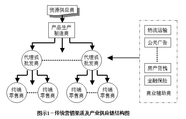 北方人所谓“猫有猫道,鼠有鼠道”,服装的营销渠道也有自身的发展特点。如果要解决服装营销渠道的问题,首先应明白什么是营销渠道? 营销渠道是当产品从生产者向最后消费者或最终产业用户转移时,直接或间接将所有权转移所经过的途径。传统的营销渠道及产业供应链的结构形同金字塔,基本如图示1所示:
