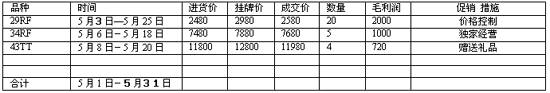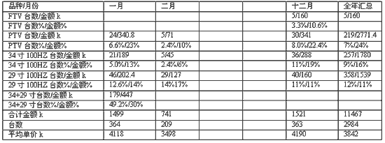 在掌握以上资料的基础上,我们要学会分析这些资料,从资料中我们知道六个合资产品占整个商场彩电全年销售的45%,特别在七月份占有率一度达到65%,可以认为该商场零售是以中高档产品为主,而平均单价我们只是在三星之上,说明我们的品牌指数还不强,我们彩电一月、七月、十月、十二月平均单价超过4000元,与公司在这一时段强力促销活动是分不开的,七月份由于空调空前的旺季成就了彩电。再从单个品种看我们在29寸100HZ、34寸100HZ彩电具备较大的优势,等离子彩电上升势头非常明显,背投彩电处于劣势。2004年的工作重点应在背头上,同时液晶彩电已上市品牌推广不佳,给我们留下了想象空间。 二.充分了解本公司的销售政策,产品导向,促销方针 知己知彼,方能百战不殆。我们在与客户谈销售任务时,应该提前了解自己公司的销售政策,产品导向。针对2004年的产品系列采取什么样的促销措施,尽早拟定一份促销方案并与市场部沟通,争取最大限度的支持。在销售政策方面,我认为应侧重在高档产品的出样支持,同时对一些滞销机的处理留有余地,千万不能用各种手段套公司政策,而应帮助客户从市场中获取合理利润。 三.以回顾的方式导入2004年客户销售目标 前面我们多角度分析了自己及相关彩电在该商场的销售状况,通过SWOT分析找出我们彩电2003年在该商场取得不错成绩的理由, 用一些图表加以阐述,在与商场经理达成一致的同时,逐步导入新的一年销售指标。