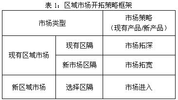 区域市场开拓一是现有区域市场拓宽,二是现有区隔市场拓深,三是新区域市场进入(如表1所示)。现有市场拓宽,是在维持现有区隔市场的基础上,通过进入新的区隔市场扩大销售;现有市场的拓深,是通过挖掘现有区隔市场的销售潜力,达到进一步扩大销售的目标。进入新的区域市场,则面临区隔市场选择,渠道选择、客户开发和目标消费群推广的工作。