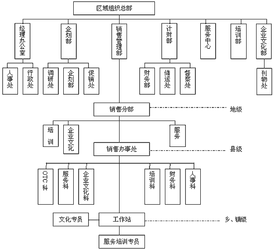 中国的营销不仅仅纵向跨度大:短短二十多年的时间就走过了西方发达国家一百多年的营销理论与实践的路程;中国的营销横向差别更大:当北边还是莽莽白雪时,南边早已春暖花开,当东南沿海地区及大城市已与国际营销接轨时,中西部诸多地区思想还原始落后…… 数据库社区服务营销是一个系统复杂的工程,具有6大优势:A、直接面对消费人群,有针对性的说服务教育;B、氛围制造销售,易于在社区周围终端等地方达到销售高潮;C、既可以进行普通宣传,又可以局部性的重点宣传;D、投入小,见效快,利于资金迅速回笼;E、迅速扩大使用人群,利用收集消费者名单,为售后服务提供详尽资料,可培养出一大批典型消费者进行区域口碑宣传;F、直接掌握消费者反馈信息,针对销售者需求及时对宣传战术和宣传方向进行调查与调整。 二、区域组织机构突围 常规的扁平化管理大都是属于中央集权制的“人治”,随着市场区域化重心的下沉,营销重心要么是向消费者更加贴近,要么越来越向地、县、乡级市场沉淀;地方差异化越来越大,市场瞬间变化多端,常规化管理很难再完全适应市场新发展,但一方面公司要能牢牢控制住各区域营销组织机构,防止出现军阀割据或员工人心涣散的局面,另一方面区域市场组织也需要越来越大的前线指挥决断权,因此区域组织机构必须在常规化管理基础上进行突围创新,要具有真正的执行和监控能力,否则就会重蹈当年三株单纯的“垂直落体”与各区域市场组织体系短时间内的分崩离析。 在实战中我发现必须实现垂直化与扁平化管理相结合,才能改变扁平化集权造成区域市场思维僵化、贻误战机、不愿承担责任、一切等靠要的现象;又能规避市场如“脱缰之马”一般无法控制的局面。 首先,深入一线设立企业文化部牢牢掌控员工的思想,企业文化实际上是一种企业的精神和企业的力量,包括道德方面的约束,这样能让员工明白是在为公司这个大家庭而工作,全体员工因为公司的理念而紧紧凝聚在一起,整个市场塑造独特的人文化的氛围,让目标人群认识、感知并接受这个企业及其产品。 其次,成立各级市场培训部让组织成为一个学习型与战斗型的组织,只有不断的学习和定期的培训,才会使每个员工不断的稳步提高自身素质和能力。区域组织机构在重视个人全面的成长时,为每一位员工的发展创造和优化学习工作环境,才能使其能承担真正的责任,充分发挥,迅速地成长。这样区域市场组织的员工就能心朝一个方向看,力向一个地方使。 同时,从上到下深入到最基层员工的服务系统让区域组织长久发展,以服务来吸引销售,因为产品越来越需要通过服务提供的附加值来增加产品对消费者的吸引力,要求我们每个企业必须提供实际与个性化的服务,只有通过持续性服务产品的创新和造势,才能拉开与竞争对手的距离,才能提升公司形象,才能形成消费者的忠诚度。 当然在这时公司的营销中心改变了原来的一部分职能,更象一个参谋部与总后勤部:拟定营销模式,通路策略,在公司预算范围内拟定行销计划,研究把握业务人员的需求而制定人员培训计划、激励政策、费销比控制机制,管理、监督与考核各区域组织机构的日常运作等。而各区域组织在营销中心管理下进行联盟式自主经营,区域组织机构必须丰富企业文化,强化组织培训,强化全程服务的同时还应设立相应的人事部、企划部、促销部、管理部、财务部、公关部等常规部门:拟定区域内的目标任务分解、组织和落实,促销计划完善,监督和指导各办事处执行情况,负责各办事处培训项目,组织各办事处对公司的销售及时回款。总体管理原则是:一切行动听指挥;下级服从上级;逐级管理,两路畅通;发挥服务、协调、督办、监控职能;全部推行管理制度科学化、组织机构明细化、岗位职责操作化、工作流程图标化、奖惩制度常年化、实施运行简明化。 我在管理交大心荣全国市场时就进行了各区域组织机构三大创新: 第一,企业文化基层分支机构随市场深入到县、乡,一些地方到了村、镇级;企业文化部直属区域经理管理,主办《市场快讯》刊物,督办各级市场墙壁文化建设和组织形式多样的活动以丰富员工业余文化生活。 区域营销机构管理组织创新结构(见图) 首先《市场快讯》将区域市场部、销售部、办事处分为几个片区,各市场企业文化部长、办事处的企业文化科长、工作站企业文化专员及优秀员工为通讯员。稿件内容主要有以下几种为必上的内容:企业文化理念;公司大政方针;市场部、销售部、办事处的战术、活动经验总结的交流材料;反映市场部、办事处精神的先进人物、典型事迹;员工合理化建议;员工优秀工作方法,员工的工作心得、图片新闻等。《市场快讯》很快成为企业文化的播种机、加油站,公司和员工沟通的桥梁、思想的纽带…… 其次每个区域组织机构一律制度上墙,建立了丰富的墙壁文化:公司理念,各岗位职责,任务曲线图,学习园地,任务倒计时等,使员工能了解公司,并能充分发挥个人的独特性来实现共同的价值观和业务目标。 另外关心员工,成为员工的坚强靠山与后盾。(1)生日礼物,区域市场每月都为员工过生日,赠送书及学习资料,让他们感到“家庭”的温暖,与公司心连心,共同发展。(2)联欢活动,切实让员工感到公司对大家的关心爱护,员工苦点、累点心里也感到舒服。(3)