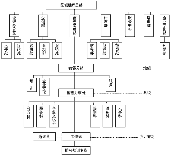 我们在学进化论时知道:在生命的演变过程中,一些生命机体变得越来越复杂,他们开始为了必要的生存资源而展开竞争,并使自己的身体结构发生变化,以适应变化了的环境,一些物种可能被另外一些物种所代替,成千上万的物种在消失的同时又有更多的新物种产生,这就是物种的多样性,市场营销组织发展的过程与物种进化的过程具有相同的道理。 另外关心员工,成为员工的坚强靠山与后盾。(1)生日礼物,区域市场每月都为员工过生日,赠送书及学习资料,让他们感到“家庭”的温暖,与公司心连心。(2)联欢活动,切实让员工感到公司对大家的关心爱护,员工苦点、累点心里也感到舒服。(3)发扬献爱心活动,对于家庭困难的员工提倡全员献爱心。 第二,培训从公司总部到到组织最底层,包括培训总监,培训部经理,培训部长,培训主管,培训专员等级别。 培训实行“高中低”“长中短”“上中下”。 “上中下”的“上”指“中央党校”即公司总部培训班,“中”指“分部党校”即各区域市场培训课程,“下”指“学习所”即各地县级办事处常规培训。 “高中低”的“高”指高级区域市场经理培训班,“中”指中层干部培训班,“低”指基层员工培训班。 “长中短”的“长”指培训时间15—1个月,“中”指培训时间为7—15天,“短”指培训时间1—7天。 每天各基层组织都必须开晨会、午会、晚会,实行日清日结,周清周报;开会既总结经验与教训,也要学习营销技巧及产品知识,还要安排短期工作内容;每个区域市场每月召集基层干部以上级别人员开一次营销培训会议,进行经验交流,培训相关知识。 培训常规内容:企业文化课,成功心态课,心荣病理、药理课,FTF营销理论课,FTF营销模拟课,OTC销售知识课等。 培训方法包括模拟培训法、经验推广培训法、现场培训法、竞争能力激励培训法、“爱心”激励培训法、野外拉练培训法等等,各级人员天天抓,时时训。 培训程序:拟定培训计划表——进行培训调查——培训设计——确定课题及时间——费用申请——下法参训通知书——实施培训——效果评估与跟踪。 第三,服务机构设置也深入到最基层,人人都是服务员,培养全员服务意识,既能解决消费者的需求,还能规避恶性危机事件,在一个区域市场中期后一定会占据主要作用。 从上到下服务中心经理,服务部部长,服务科长,服务培训专员等。 最基层都设置了服务机构,它与销售管理等机构组织平行建制; 编制如下: 一对一服务性质逐渐变成消费者日常生活顾问、家庭医生的角色,回访员定期到患者家为消费者提供免费上门服务,包括:用药、康复训练指导,心理咨询等服务。既树立了企业形象与风格,还沟通了企业与患者的感情,同时为企业上层提供了新产品开发与产品改进的决策依据。 区域营销组织机构创新能迅速让市场各级人员追随公司企业文化理念与领会区域市场的总体安排,能让每个员工掌握优秀方法迅速在市场推广,能充分调动基层每一个员工的积极性,能让市场角落的信息能很快反馈回上级并对下一步行动提供参考意见。当然不是一个市场一开始就能扩大,有些市场是由一个办事处发展到一个销售部,再由销售部发展到区域市场总部;有些市场则是先建区域市场总部再向下面迅速扩展,这些都必须针对公司人员储备情况及各市场情况不同而采用不同的步骤。 在常规营销组织机构运转不灵与艰难的今天,适应新市场发展的组织形式需要不同。市场营销的重心不断的向下沉淀,越来越依赖于区域营销的战略战术。笔者针对众多厂家的市场情况并结合自己多年的区域营销管理经验提出以上微薄创新经验,但愿能对一些公司有所帮助。 作者: 陈志怀 |