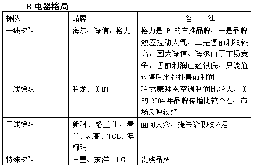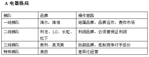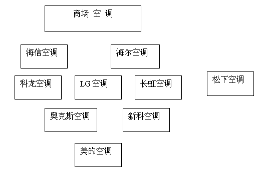备注:以一个普通商场为例,仅供参考!! 整个品牌架构都是统领在“1”个主品牌商场品牌下的,接下来就是“2”线品牌,主打品牌,“3”线品牌,低端品牌,“4”线品牌,特殊运作的品牌, 主品牌:商场空调,例如:国美空调 ,苏宁空调,三联空调 子品牌梯队: 商场一线品牌:海尔,海信 商场二线品牌:LG,科龙,长虹 商场三线品牌:奥克斯,新科,松下 特殊运作品牌:美的 下面讨论一下这个大品牌统领下的多元化复合品牌市场运作思想: 主品牌运作思路: 在一般的运作中,主品牌都会附加一个特色的宣传卖点,例如:三联空调,终生免费移机,苏宁空调,至真至诚的服务,国美空调的金牌空调等等,所有空调的运作都是在这个特色卖点的支撑下来维系的; 一线品牌运作思路: 无论从销售数量,还是销售质量分析,一线品牌在区域市场上占比都非常大,这里的说的一线品牌仅仅是针对区域市场而言,例如,在山东,海尔,海信的市场份额就比较高,而到了广东,就是格力,美的,一线品牌运作成功与否,对商场主品牌运作影响比较大。 但是从利润质量分析,一线品牌并不是主要利润的来源,但是一线品牌可以聚集人气,与主品牌相得益彰,提高成交几率,从而为其它品牌创造更多的销售机会。 在运作这一线品牌时,建议基本运作思路是长线产品上柜,突出差异化型号销售,一线品牌的利润低都是大家所公认的,因此,必须突出长线产品上柜,但是一定突出差异化销售,例如:包销型号,定制型号,专供型号,只有这样才能做到既可以上量,也可以提高利润。 终端生动化建设 终端所有产生销售机型必须占到样机总数的90%,正常销售机型库存必须占到品牌库存的60%,挂机柜机比例必须达到公司要求的比例。 终端海报、爆炸贴、促销海报、宣传海报,必须定期更换,保持清新整洁的宣传风格。 必须悬挂公司的新年度的形象产品,例如:海信的变频真流系列,海尔的氧吧智慧眼系列,并作个性化包装。 重点推广机型必须做迷惑式包装,即在一个机型上必须贴上两个以上的活动爆炸贴,对顾客来说是起到吸引顾客眼球作用,但是对竞争对手来说科一起到迷惑对方作用。 公司提供的演示道具,比如海信公司的变频演示,海尔公司的氧吧演示,都必须通电演示,展现动态演示效果。 促销资源的最优占用 占用公司的最大的促销资源 只要是厂家提供的赠品,必须打破厂家提供的赠品匹配方案,必须按照商家库存来适当调剂赠品,并要求赠品活动方案区别于竞争对手。 优秀促销导购的配置与管理 公司必须提供本公司最优秀的终端导购员,必须具备丰富的产品知识,一定的心理素质,敬业精神,吃苦精神,风吹不到的韧劲。 促销活动的持久化与爆炸性 促销活动在终端表现必须是连续的,并且是持久性的,并且具有爆炸性,无论是采用何种形式的。 二线品牌思路: 运作二线品牌是否成功直接关系到商家毛利率的升降,二线品牌队公司的贡献率与到达率都比较高,因此商家往往在一线品牌的掩护下主推二线品牌,二线品牌更需要厂家提供比较大的资源,在充分利用厂家资源的基础上,适当偏重增加商家资源,在终端推广中加以重点推介。 三线品牌运作思路: 三线品牌一般使用来防御市场的,三线品牌最大的优势是价位上的优势,最大的劣势在与售后服务的滞后效应,比如乐华空调,开始运作时为很多商家的重点推广品牌,但是乐华品牌轰然倒塌退出市场后,引起的一系列影响都会不同程度的影响形象。还有一点非常重要的是,特别注意在空调旺季一定要将三线品牌库存降到最小,这些品牌有可能到了旺季会出现连续画圈的可能性。 特殊梯队运作: 现在,在很多地级市的很多百货业态商场,都采用代货安装的操作模式,代理商租赁商家的场地,每月提供一定的费用,安装费用按照一定的比例分成,我们称之为,特殊梯队,鉴于特殊梯队在业务操作模式上的差异,在商家没有库存,也就没有资金占用,因此,相对产品代理商而言,商家只是租用给对方场的,提供一个形象宣传与终端流通平台,因此,这个特殊品牌在主空调这个大品牌内只能是一个补给型品牌,但是在规划特殊品牌时,经营策略更是差异化经营中的差异化运作,否则会产生负赢利效应,即:对厂家来说是赢利的,可能是不赢利的,但是对商家来说,却是负赢利的,因为商家的销售收入包括正常差价收入与非营业收入,在非营业收入保持一定的情况下,正常差价收入相比较商家投入的展台资源、赠品资源、人力资源就表现出负得差值,运作一个品牌出现了边际效应过了赢亏点出现反向曲线时,对我公司形成了潜亏,所以在运作这个特殊品牌时,不打价格战,而是打差异化型号的价值服务战。 下面为某区域内两个家电连锁品牌的空调格局分析: