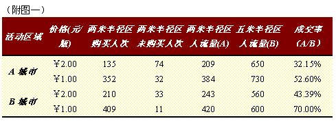在区域营销活动中,重渠道而轻消费者是各厂家的通病,原因很简单,相比之下,渠道客户在“明处”,而消费者在“暗处”,渠道更容易把握。市场从渠道推动起来比较直观,但是要从消费者这边来拉动,就得要见真功夫,从哪里来拉动?为什么要在那里发力?这是在许多厂家面前一个年轻的课题。 在其间,市场调查占据举足轻重的地位,如果单就市场调查而做市场调查,很不划算,而统一企业在推广促销的过程中来做市场调查,并且进行区域自我诊断,成功找到市场拓展的切入点。 一、出师不利,市场受挫 统一企业在2001年三月份推出500mlPET瓶装鲜橙多饮料时,面市定价3.5元每瓶。凭着统一企业对渠道超强的掌控能力,经过几个月的强攻,各地区终端铺市率极高,连他们自己都觉得意想不到,而且有央视和地方电视等强势媒体给予空中支援,很多城市陆续激活市场,唯独安徽省A市却一直不温不火。 区域销售业绩不佳,总结会议上,各路英雄各抒己见,理由很多,主要的不外乎有四种:其一,产品价格偏高,超出当区顾客的平均消费能力;再者,有可能是产品力不够,比如口味不适合局部地区消费者;或者是知名度不够,产品铺市率、曝光率不高,导致销售力不强,消费者没有重视和关注,只是供方一头热;最后,也有可能是消费者还没有养成特定的消费习惯。 “没有调查,就没有发言权”,谁也不敢拍着胸脯说个一五一十,虽都有可能,但事实上总会有最根本的原因,只有找到症结所在,才能对症下药。既能有效,快捷地祛除病根,迅速提高销量,又能提高推广费用地利用效率。 二、投石问路,定价测试 区域市场如何进行自我诊断?首当其冲是考虑产品本身,如果产品力不够,宣传推广做得再好,也是空中楼阁,最终会因为没有产品力作支撑而坍塌。市场诊断还得步步为营,从价格和口味调查做起。 为了调查当区顾客是否觉得定价太高,因为消费能力所限,而导致需求不足,统一公司同时选定同级别的两座城市,另一座城市的销售情况较好,在两地同时进行“限时抢购”的特价试销,活动分两次进行。 首先选定最热闹,人流量最大的商场门口或集市中心,但是顾客构成应尽可能符合产品的目标受众要求,然后做个1×2平米的落地堆码,或者更大,重要的是用“斗大”的POP来告诉消费者两元钱/瓶的惊爆价、促销价,限时抢购一小时,旨在把现场尽量布置得引人注目,吊足消费者的胃口。 在堆码的周围设置两米半径区和五米半径区,凡是走进两米半径区的顾客,认为是对该价格接受,凡走进五米半径区的顾客被看作是被此活动内容所传达到(reach)的目标受众。并专门指定工作人员记录这些人流量的数据,以做日后分析之用。 从概率的角度来看,那些与活动和产品毫不相干的人(比如:不属于目标定位消费层的游客)接近两个区域的数量在各区域统计人数中所占比重相当,在数据处理的时候以相对数为主,而非绝对数,也就剔除了“无相关游客”的干扰。 活动结束后,再过一周,在同一地方,以同样的形式再做一次,唯独价格改为一元/瓶。工作人员增加,一是保证每个想买的顾客都会在指定的时间内买到产品;再者,确保活动现场畅通无阻,不会因为拥挤不堪而失去部分销售机会。 两次活动下来,我们就可以得到一组对比数据,如附图一: