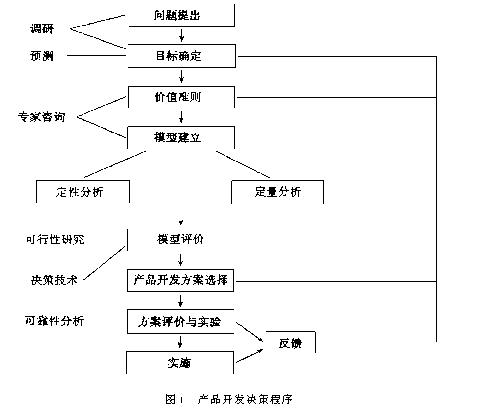 主要就产品开发决策支持系统(PDDSS)开发中的有关理论、方法和技巧等进行了探讨,包括产品开发决策程序和PDDSS开发的意义、PDDSS的总体设计、PDDSS的模型子系统和数据子系统设计等,对提高企业产品开发决策水平和企业管理专项决策支持系统的开发有一定的参考价值 0 引 言 决策支持系统(DSS)是一种以支持非结构化(或半结构化)决策问题为主要目标和基本特征的计算机信息系统.近年来,DSS无论在其理论研究方面还是应用领域均得到了长足的发展,尤其在企业管理系统中,随着计算机应用向着更高层次的发展,越来越多的企业迫切地希望把DSS引入管理决策中,以实现管理现代化和决策科学化.但是在我国企业计算机应用中,用于企业管理专项决策辅助的DSS实用系统仍不多见.本文以河北省科委立项课题“河北省中小型机械企业经营决策支持系统研究”为基础,就产品开发专项决策支持子系统(Product Development Decision Support System,PDDSS)开发实践中的若干问题进行论述. 1 产品开发决策支持的程序及开发PDDSS的意义 对现代企业来说,市场竞争的本质是技术的竞争.开发新产品是企业生存和发展的需要,也是不断提高企业技术水平的需要.因此,产品开发决策是企业重要的战略性决策.产品开发决策的内容和程序如图1所示.