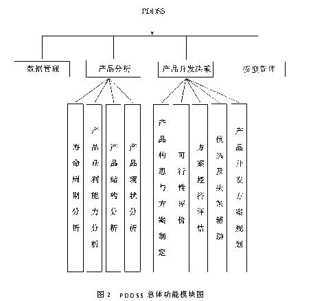 显然,产品开发决策是一个提出问题、分析问题和解决问题的动态发展过程,它是一项复杂的智力活动.这一决策过程受到诸多因素影响,涉及范围广,决策对象结构复杂,因此产品开发决策者必须及时、方便、准确地获取有关信息,并结合科学的方法和模型的处理才能进行有效的决策.因此,利用计算机辅助决策者进行产品开发决策即产品开发决策支持系统(PDDSS)的研制和开发势在必行. 在PDDSS的研制和开发中,通过大量调研分析并且把握了产品开发决策的内容、程序和决策活动规律,在此基础上,运用系统思想,综合利用各种科学知识和技术手段实现对产品开发决策的辅助和支持,因此,PDDSS的研制和开发具有如下意义: ①提高产品开发决策的效率,并使决策更加科学化、程序化和自动化,有利于减少凭经验决策造成的重大失误. ②有利于决策者学习产品开发决策的方法和知识,提高决策者素质和决策水平. ③对我国企业计算机应用向着更高层次的发展和对DSS的理论研究均有促进作用. 2 PDDSS的总体设计 PDDSS的开发基本思想是用系统工程思想,以计算机为基础通过数据、模型和知识来辅助企业中、高级管理者完成新产品的开发决策任务. 2.1 PDDSS的开发策略 在PDDSS开发中,特别注重以下3点: ①PDDSS开发紧密结合河北省中小型机械企业的产品开发决策实际.因为一个具有生命力的DSS不仅取决于技术上的成功,更应有良好的应用环境,因此,在PDDSS开发中强调PDDSS的实用性,特别是对我国国情和具体厂情的适应性. ②充分吸收其它信息系统开发中的有关技术和成功经验,诸如EDP,MIS,OA,ES等开发中信息处理技术以及有关的DSS技术工具(DSST). ③针对问题快速研制原型系统,并在实施中不断完善. PDDSS实质上是一个具有较高通用性的原型系统.在明确和归纳了一般企业产品开发过程的基础上,吸收成功的技术和经验,采用快速原型方法在短周期内开发PDDSS原型系统是保障开发效率和开发效果的明智策略.PDDSS原型系统投入实际企业接受检验并转换成专用PDDSS的工作正在进行中. 2.2 PDDSS的功能和结构 PDDSS的功能首先体现在对产品开发决策过程实现有效的辅助和支持,它包括产品开发方案的构思、评价和优选等步骤,每一阶段都强调功能的实际针对性,为决策提供有用信息.同时,PDDSS还提供现有产品分析、数据管理和模型管理的功能.PDDSS功能模块见图2.