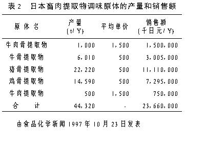日本最近的天然调味料市场规模是:天然调味料原体年产约10万吨,金额为800亿日元。其中70%是提取物类调味料成为主流,据推测,当前已成为调味料市场主流的天然调味料的市场目标已经瞄准以中国为首的东南亚市场,出现了向国际化方向发展的动向。 1 畜肉提取物调味料的现状 据估计,目前日本年生产约4万吨畜肉提取物原体,加上配制型调味料,共计生产7万吨以上。在畜肉提取物原体中,包括Bx40-50的猪提取物约2.2万吨,鸡提取物1.5万吨和牛提取物0.6万吨。此外,以外食产业为中心利用的Bx5-20的原汁型提取物年产量约为2.7万吨,见表2。