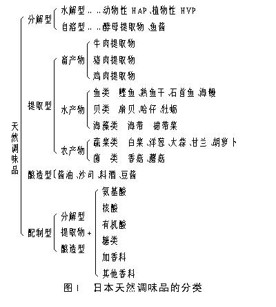 近年来,日本的调味倾向有浓重和轻淡调味二极分化发展的趋势,迎来了调味技术复合化的新时期。 天然调味料的原料可以分为畜肉类、鱼介类和蔬菜类等,经过分解或提取和精制而成的分解型,提取型和酿造型等三大类。天然调味料没有化学调味料单品的复杂风味和浓重味,它具有原料固有的独特的香味,同食品风味密不可分,是加工食品调味时不可缺少的辅助材料。见图1。