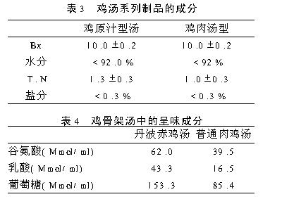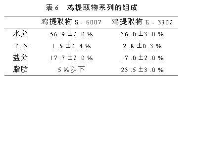 鸡提取物S系列是经常压提取和浓缩后,再还原成原汁型鸡骨架汤的制品,鸡提取物犈系列是酶解型制品,具有原料红鸡固有的鲜味和丰富的香味。而且又通过提取后的特殊处理,赋予加热煮制的调理感。两种类型的产品都在工艺中生成了烹饪香味的前体物质,都具有耐加热蒸煮的特性,可广泛应用于各种汤和加工食品中。特别是加热调理食品可由此获得稳定的风味效果。两种系列制品组成见表6。
