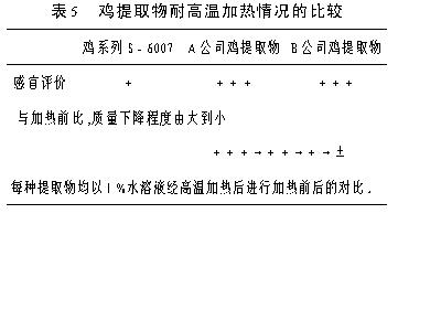 烹饪香味物质的特征是耐热。可以用于各种高温加工的食品中。鸡系列调味提取物就是利用了这种加工原理和技术生产而成,风味的耐热是它的最大特征见表5。
