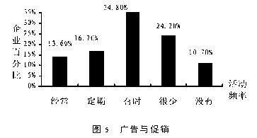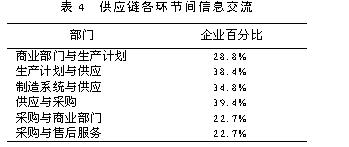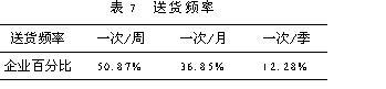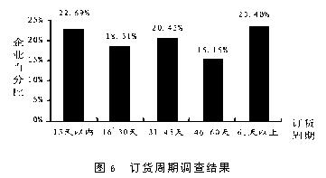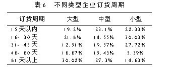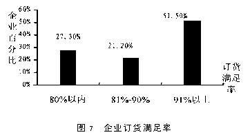 在对我国企业问卷调查基础上,对销售和售后服务部分进行了统计分析,从而对我国企业供应链管理水平有了一定了解,并指出了对供应链管理有利的条件和不利之处 1.4. 促销策略 促销策略主要从两方面考虑,一是销售人员比例,二是采用广告等促销策略. 1.4.1 销售人员的比例企业销售人员比例的调查情况如下表1所示: 统计结果显示,平均有25.4%的企业销售人员比例在2%以内,37.3%的企业销售人员比例在2%-5%之间,30.5%的企业销售人员比例在5%10%之间.从企业规模看,大型企业由于人员基数大,销售人员比例自然小于小型企业,但大多数企业的销售人员比例控制在10%以内,只有少数大型企业由于没有分销商其销售人员比例大于21%,属于两头大中间小的企业,大型企业分销商比小型企业多,产品销售主要通过分销商进行,而小型企业有近20%的企业销售人员比例在10%以上,说明小型企业在销售方面主要依靠自我推销,而大型企业则可通过分销商形成供应链结构,即形成所谓的资源外利用优势. 1.4.2 广告促销策略 广告促销是企业对产品和自身形象的宣传,是经营的一种有效手段,世界许多著名的企业都非常重视,用来拓展市场.从图5看出,经常做广告和促销的企业只有13.6%,定期做广告和促销的只有16.7%,34.8%的企业只是偶尔做广告和促销,有34.8%的企业很少或没有做广告和促销,另从不同企业规模看,大型企业经常做广告和促销的企业有22%,中型企业只有8%,小型企业有12.5%,在经常和定期做广告和促销的企业中,大型和小型企业占比例较多,而中型企业则很少,一般大型企业有稳定品牌,容易实施名牌战略,有资本也愿意做广告和促销,而小型企业为了和大型企业竞争, 抢占市场,也愿意做广告和促销,中型企业在做广告和促销方面表现得不是很积极. 1.5 产品价格浮动情况 价格是个敏感的杠杆,一般顾客都希望买到价廉物美的产品,如果价格波动幅度大,顾客会考虑这种产品的实际价值,含有多少水分,因而产生了对这种产品的不信任感或存在等降价再买的观望心理,影响到销售.对企业而言,价格浮动越大,给自身和分销商带来的市场风险越大,但是如果抓住时机,短期利润高. 从表2看出,企业(约66%)有较好的价格稳定性.进一步分析表明:机械类企业价格浮动主要在±5%、少数在±20%,电子类价格浮动在±10%,少数在±20%,轻工类主要在±10%,少数在±2%,“其他类”在±2%,即电子和轻工类价格浮动较大. 1.6 销售信息反馈及市场预测 信息时代的来临,尤其是电子数据交换(EDI)和计算机网络的发展使商业活动更加信息化和现代化,有效地推进了全球供应链管理,表3和表4为调查情况 从表3看出,目前使用EDI进行商务活动的企业为数不多(不到1燉5).在这些企业中还主要是和部分供应商、部分顾客及银行和销售网点进行数据交换,信息交流面比较窄,这主要是受到资金、技术及人员计算机素质等因素的限制.从企业自身供产销各环节使用信息技术交流来看,情况也不理想(见表4).而且供应和生产间交流信息比生产和销售间的交流多,使企业的注意力集中于企业内部,特别是关心生产,对市场变化把握不住,大大制约了企业响应市场的能力.因此需要加强部门之间的信息交流,达到共享生产计划数据,设计数据和产品数据及其他相关信息.有市场信息反馈网络的企业很少,多数企业只有简单的市场调查和预测,缺乏应有的市场分析和信息反馈. 1.7 销售部门和生产部门的联系 从企业采用的生产方法可以了解销售部门与生产部门的联系是否紧密. 看板管理是从尽快满足顾客需要出发逆向考虑期、量,减少库存成本和交货期,而工艺或技术导向组织生产和顾客需要有些脱节,在交货期上反映迟钝.用户驱动方法能从交货期上较好的满足顾客,但是是否生产太依赖于用户定单.由表中看出,企业生产主要是依靠工艺或技术导向方法,看板和用户驱动的生产方法采用的企业少,销售和生产体系还是处于分割状态. 2 售后服务 售后服务一方面可以了解用户对产品的满意程度,获得顾客的反馈信息,从而改进产品设计和质量管理;另一方面能加强企业和分销商、企业和用户之间的联系,提高供应链的管理水平.供应链管理中的售后服务质量又不同于一般意义上的售后服务质量.后者只是着眼于企业自身,为了推销产品,为了争夺市场,为了赢利.而前者是以顾客为中心,着眼于使顾客满意.竞争也随之从产品竞争转化为使顾客满意的竞争,使顾客满意决定了企业的生存与发展. 2.1 订货周期 订货周期是判断用户、顾客要求高低的一个指标.订货周期短,说明对方要求零库存或者快速响应市场变化,如果一个企业对用户需求的响应速度慢,不利于企业在竞争中吸引和留住客户;相反,企业能够满足用户的时间要求,可以压缩整个供应链物流流通时间,提高供应链运作效率. 从表6看出,中小型企业订货周期比大型企业短,说明大型企业在快速反应能力方面比中小型企业差,大型企业需要提高敏捷性和快速反应能力.订货周期偏长,可能是库存多,这一点可从问卷中企业自身购买原材料和零部件频率的情况推测出.事实上,非起点、终点企业既是下一级节点企业的供应商,又是上一级节点企业的用户,它们购买原材料和零部件频率也是一次燉月和一次燉季的居多,库存更新时间主要在31-40天,库存量偏大. 2.2 用户订货要求 这里用户订货要求主要是从企业交货频率和订货有无批量